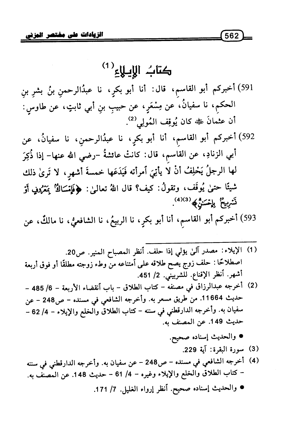 592 - أَخْبَرَكُمْ أَبُو الْقَاسِمِ، أنا أَبُو بَكْرٍ، نا عَبْدُ الرَّحْمَنِ، نا سُفْيَانُ، عَنْ أَبِي الزِّنَادِ، عَنِ الْقَاسِمِ، قَالَ: كَانَتْ عَائِشَةُ، رَضِيَ اللَّهُ عَنْهَا، إِذَا ذَكَرَ لَهَا الرَّجُلُ يَحْلِفُ أَنْ لا يَأْتِيَ امْرَأَتَهُ فَيَدَعَهَا خَمْسَةَ أَشْهُرٍ، لا تَرَى ذَلِكَ شَيْئًا حَتَّى يُوقَفَ، وَتَقُولُ كَيْفَ؟ قَالَ اللَّهُ تَعَالَى: {فَإِمْسَاكٌ بِمَعْرُوفٍ أَوْ تَسْرِيحٌ بِإِحْسَانٍ} [البقرة: 229]