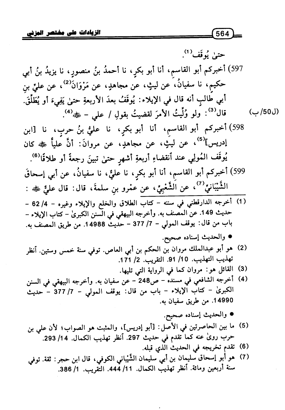 598 - أَخْبَرَكُمْ أَبُو الْقَاسِمِ، أنا أَبُو بَكْرٍ، نا عَلِيُّ بْنُ حَرْبٍ، نا ابْنُ إِدْرِيسَ، عَنْ لَيْثٍ، عَنْ مُجَاهِدٍ، عَنْ مَرْوَانَ: أَنَّ عَلِيًّا رَضِيَ اللَّهُ عَنْهُ كَانَ يُوقِفُ الْمُولِي عِنْدَ انْقِضَاءِ أَرْبَعَةِ أَشْهُرٍ حَتَّى تَبِينَ رَجْعَةً أَوْ طَلاقًا