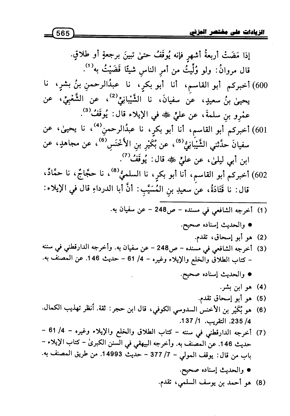 600 - أَخْبَرَكُمْ أَبُو الْقَاسِمِ، أنا أَبُو بَكْرٍ، نا عَبْدُ الرَّحْمَنِ بْنُ بِشْرٍ، نا يَحْيَى بْنُ سَعِيدٍ، عَنْ سُفْيَانَ، نا الشَّيْبَانِيُّ، عَنِ الشَّعْبِيِّ، عَنْ عَمْرِو بْنِ سَلَمَةَ، عَنْ عَلِيٍّ رَضِيَ اللَّهُ عَنْهُ فِي الإِيلاءِ، قَالَ: يُوقَفُ.