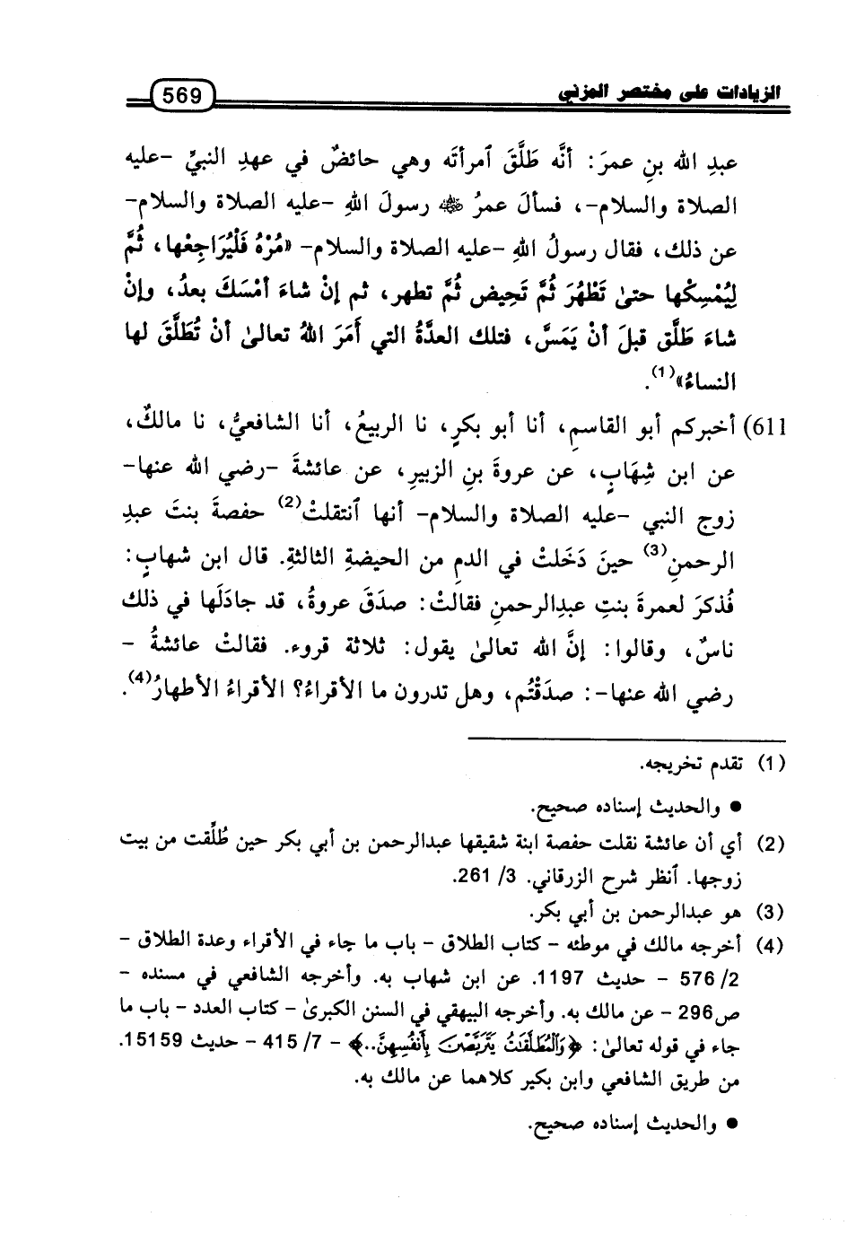 611 - أَخْبَرَكُمْ أَبُو الْقَاسِمِ، أنا أَبُو بَكْرٍ، نا الرَّبِيعُ، أنا الشَّافِعِيُّ، نا مَالِكٌ، عَنِ ابْنِ شِهَابٍ، عَنْ عُرْوَةَ بْنِ الزُّبَيْرِ، عَنْ عَائِشَةَ، رَضِيَ اللَّهُ عَنْهَا، زَوْجِ النَّبِيِّ، عَلَيْهِ الصَّلاةُ وَالسَّلامُ، أَنَّهَا انْتَقَلَتْ حَفْصَةَ بِنْتَ عَبْدِ الرَّحْمَنِ حِينَ دَخَلَتْ فِي الدَّمِ مِنَ الْحَيْضَةِ الثَّالِثَةِ.