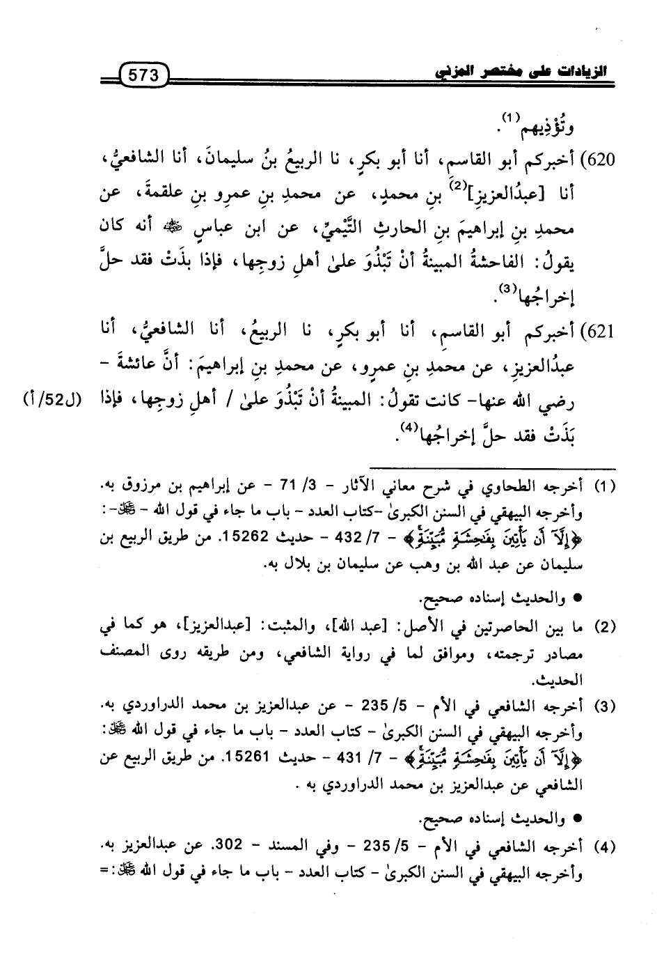 620 - أَخْبَرَكُمْ أَبُو الْقَاسِمِ، أنا أَبُو بَكْرٍ، نا الرَّبِيعُ بْنُ سُلَيْمَانَ، أنا الشَّافِعِيُّ، أنا عَبْدُ الْعَزِيزِ بْنُ مُحَمَّدٍ، عَنْ مُحَمَّدِ بْنِ عَمْرِو بْنِ عَلْقَمَةَ، عَنْ مُحَمَّدِ بْنِ إِبْرَاهِيمَ بْنِ الْحَارِثِ التَّيْمِيِّ، عَنِ ابْنِ عَبَّاسٍ رَضِيَ اللَّهُ عَنْهُ أَنَّهُ يَقُولُ: الْفَاحِشَةُ الْمُبَيِّنَةُ أَنْ تَبْذُوَ عَلَى أَهْلِ زَوْجِهَا، فَإِذَا بَذَتْ فَقَدْ حَلَّ إِخْرَاجُهَا