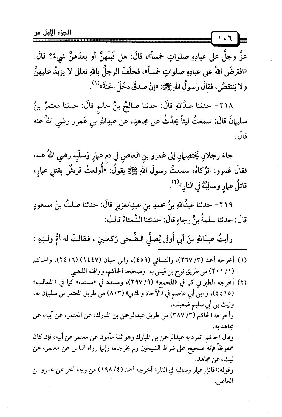 218 - حدثنا عبدُاللهِ قالَ: حَدَّثَنَا صالحُ بنُ حاتمٍ قالَ: حَدَّثَنَا معتمرُ بنُ سليمانَ قالَ: سمعتُ لَيْثًا يحدِّثُ عن مجاهدٍ، عن عبدِاللهِ بنِ عَمرو رَضِيَ اللهُ عَنْهُ قالَ: