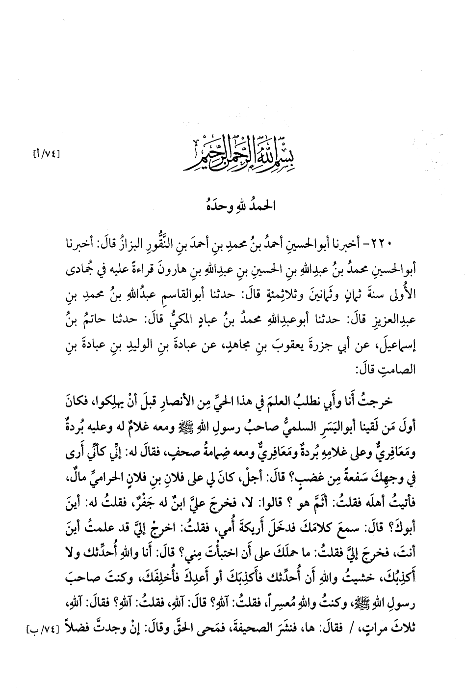 220 - أخبرنا أبوالحسينِ أحمدُ بنُ محمدِ بنِ أحمدَ بنِ النَّقُّورِ البزازُ قالَ: أخبرنا أبوالحسينِ محمدُ بنُ عبدِاللهِ بنِ الحسينِ بنِ عبدِاللهِ بنِ هارونَ قِرَاءَةً عَلَيْهِ فِي جُمادى الأُولى سنةَ ثمانٍ وثَمانينَ وثلاثِمئةٍ قالَ: حدثنا أبوالقاسمِ عبدُاللهِ بنُ محمدِ بنِ عبدِالعزيزِ قالَ: حدثنا أبوعبدِاللهِ محمدُ بنُ عبادٍ المكيُّ قالَ: حَدَّثَنَا حاتمُ بنُ إسماعيلَ، عَنْ أَبِي جزرةَ يعقوبَ بنِ مجاهدٍ، عَنْ عبادةَ بنِ الوليدِ بنِ عبادةَ بنِ الصامتِ قالَ: