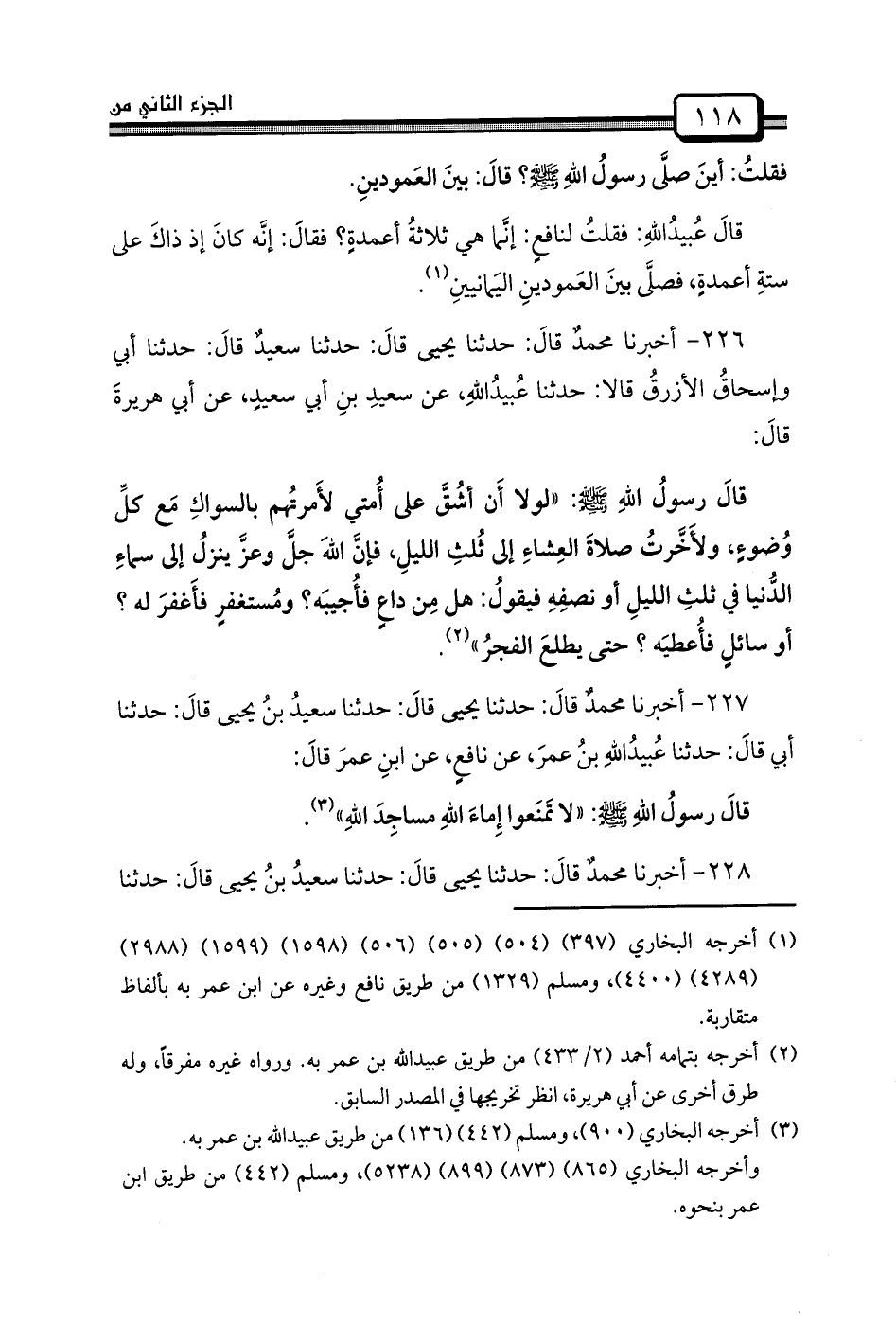 228 - أخبرنا محمدٌ قالَ: حدثنا يحيى قالَ: حدثنا سعيدُ بنُ يَحْيَى قالَ: حَدَّثَنَا -[119]- أَبِي قالَ: حدثنا عُبيدُاللهِ بنُ عمرَ، عن نافعٍ، عن ابنِ عمرَ قالَ: