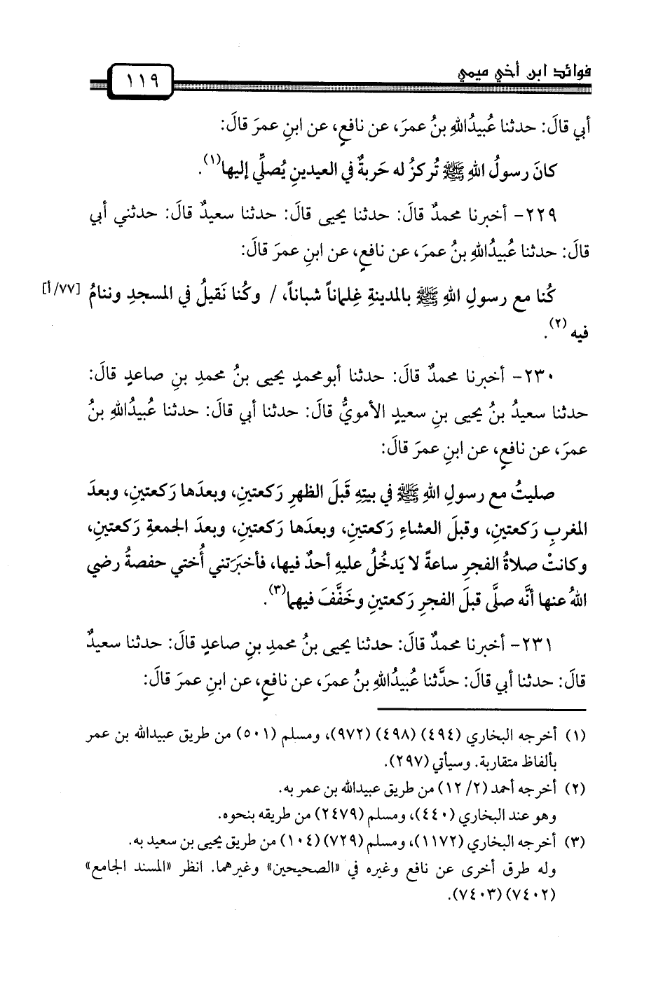 230 - أخبرنا محمدٌ قالَ: حدثنا أبومحمدٍ يَحْيَى بنُ محمدِ بنِ صاعدٍ قالَ: حَدَّثَنَا سعيدُ بنُ يَحْيَى بنِ سعيدٍ الأمويُّ قالَ: حدثنا أبي قالَ: حدثنا عُبيدُاللهِ بنُ عمرَ، عن نافعٍ، عن ابنِ عمرَ قالَ: