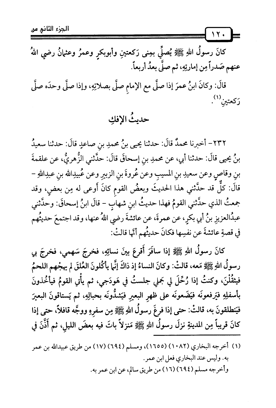 قالتْ: فواللهِ إنِّي لقاعدةٌ إِذْ مرَّ صفوانُ بنُ المُعطِّلِ السُّلميُّ، وكانَ تخلَّفَ لبعضِ حاجتِهِ عَنِ العسكرِ فلم يَثبْ مَعَ الناسِ، فرأَى سَوادي فأقبَلَ حَتَّى وقفَ عليَّ، وَقَدْ كانَ يَراني قبلَ أَن يُضربَ عَلينا الحجابُ، فلمَّا رَآنِي قالَ: إنَّا للهِ وإنَّا إِلَيْهِ راجِعونَ، أَظعينةُ رسولِ اللهِ صَلَّى اللَّهُ عَلَيْهِ وَسَلَّمَ؟ وأَنا مُتلففةٌ فِي ثِيابي، فقالَ: مَا حملَكِ رحمَكِ اللهُ عَلَى هَذَا؟ قالتْ: فأخبرتُه الخبرَ، قالتْ: فأناخَ واستأخَرَ عنِّي وقالَ: ارْكبي، فركبتُ، وأخذَ برأسِ البعيرِ مُسرعاً يطلبُ الناسَ، قالتْ: فواللهِ مَا أدركَ الناسَ وَلا افتُقِدتُ حَتَّى أَصبحتُ ونزلَ الناسُ، فلمَّا اطمأنُّوا طلعَ الرجلُ يقودُ بِي فقالَ أهلُ الإفكِ مَا قَالوا وارتجَّ العسكرُ، واللهِ مَا أعلمُ بشيءٍ مِن ذلكَ، وَقَدِ انتَهى الحديثُ إِلَى رسولِ اللهِ صَلَّى اللَّهُ عَلَيْهِ وَسَلَّمَ وَإِلَى أبوَيَّ لا يبلُغُني مِن ذلكَ قليلٌ وَلا كثيرٌ، إِلا أنِّي قَدْ أنكرتُ مِن رسولِ اللهِ صَلَّى اللَّهُ عَلَيْهِ وَسَلَّمَ بعضَ لُطفِهِ إِذَا اشتَكيتُ، كنتُ إِذَا اشتَكيتُ لطفَ بِي ورحِمَني، فَلَمْ يفعلْ بِي ذلكَ فِي شَكْوَتِي، فَقَدْ أنكرتُ ذلكَ مِنه إِذْ دخلَ عليَّ وعِندي أُمي تُمرِّضُني قالَ: "كيفَ تِيكم؟ " لا يزيدُ عَلَى ذلكَ، قالتْ: حَتَّى وجدتُ فِي نَفسي، فقلتُ: يَا رسولَ اللهِ، لَوْ أَذنتَ لِي حَتَّى أنقلِبَ إِلَى أُمي وأَبي فيُمرِّضاني، قالَ: -[122]- "لا عليكِ"، قالتْ: وإنَّما قلتُ ذلكَ حينَ رأيتُ مِنه مَا رأيتُ مِن جفائِهِ، فانقلبتُ إِلَى أُمي وَلا أعلمُ شَيْئًا مِما كانَ حَتَّى نَقِهتُ مِن وَجَعي ذلكَ بعدَ بضعٍ وعشرينَ لَيْلَةً، وكُنا قَوْمًا عَرَبًا لا نتخذُ فِي بُيوتِنا الكُنُفَ الَّتِي تَتخذُ الأعاجِمُ نعافُها ونكرهُها، / وإنَّما كُنا نذهبُ فِي سفحِ المدينةِ.