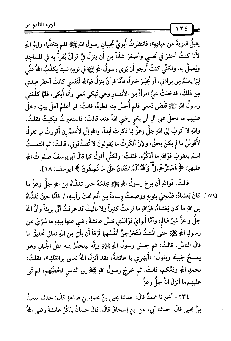 234 - أخبرنا محمدٌ قالَ: حدثنا يحيى بنُ محمدِ بنِ صاعدٍ قالَ: حدثنا سعيدُ بنُ يحيى قالَ: حَدَّثَنَا أَبِي، عَنِ ابنِ إسحاقَ قالَ: قالَ حسانُ يذكُرُ عائشةَ رَضِيَ اللهُ -[125]- عَنْهَا:
