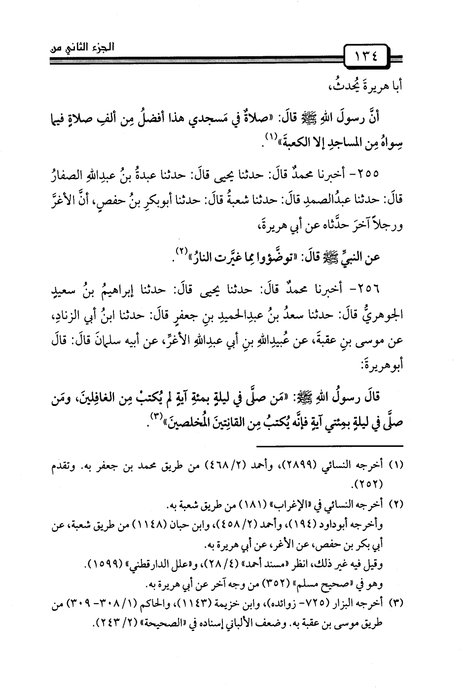 255 - أخبرنا محمدٌ قالَ: حدثنا يحيى قالَ: حدثنا عبدةُ بنُ عبدِاللهِ الصفارُ قالَ: حدثنا عبدُالصمدِ قالَ: حدثنا شعبةُ قالَ: حدثنا أبوبكرِ بنُ حفصٍ، أنَّ الأغرَّ وَرَجُلًا آخرَ حدَّثاه عَنْ أَبِي هريرةَ،