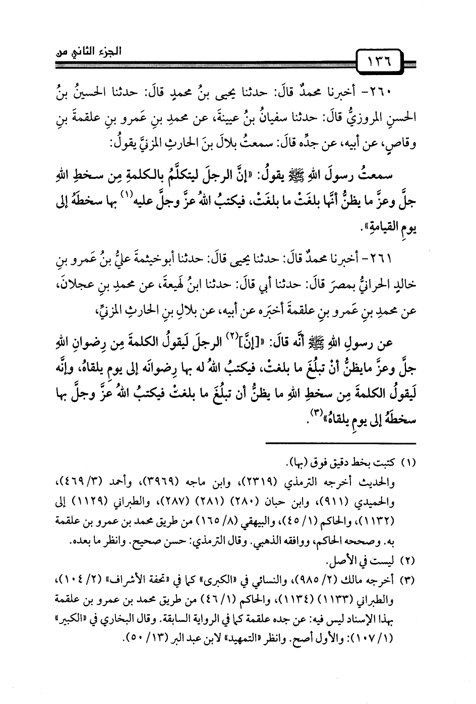 عَنْ رسولِ اللهِ صَلَّى اللَّهُ عَلَيْهِ وَسَلَّمَ أنَّه قالَ: " [إنَّ] الرجلَ لَيقولُ الكلمةَ مِن رِضوانِ اللهِ جلَّ وعزَّ مايظنُّ أنْ تبلُغَ مَا بلغتْ، فيكتبُ اللهُ لَهُ بِهَا رِضوانَه إِلَى يومِ يلقاهُ، وإنَّه لَيقولُ الكلمةَ مِن سخطِ اللهِ مَا يظنُّ أَنْ تبلُغَ مَا بلغتْ فيكتبُ اللهُ عزَّ وجلَّ بِهَا سخطَهُ إِلَى يومِ يلقاهُ".