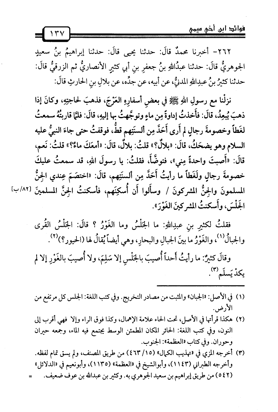 نزلْنا مَعَ رسولِ اللهِ صَلَّى اللَّهُ عَلَيْهِ وَسَلَّمَ فِي بعضِ أسفارِهِ العَرْجَ، فذهبَ لحاجتِهِ، وكانَ إِذَا ذهبَ يُبعِدُ، قالَ: فأَخذتُ إِدَاوَةً مِن ماءٍ وتوجَّهتُ بِهَا إليهِ، قالَ: فلمَّا قاربتُهُ سمعتُ لغَطاً وخصومةَ رجالٍ لم أَرى أَحَدَّ مِن ألسنَتِهم قطُّ، فوقفتُ حَتَّى جاءَ النبيُّ عَلَيْهِ السَّلامُ وَهُوَ يضحَكُ، قالَ: "بلالٌ؟ " قلتُ: بلالٌ، قالَ: "أمعَكَ ماءٌ؟ " قلتُ: نَعم، قالَ: "أَصبتَ وَاحِدَةً مِني"، فتوضَّأَ، فقلتُ: يَا رسولَ اللهِ، قَدْ سمعتُ عليكَ خصومةَ رجالٍ ولَغَطاً مَا رأيتُ أَحَدَّ مِن ألسنَتِهم، قالَ: "اختصَمَ عِندي الجِنُّ المسلمونَ والجِنُّ المشركونَ / وسأَلوا أَن أُسكِنَهم، فأسكنتُ الجِنَّ المسلمينَ الجَلْسَ، وأَسكنتُ المشركينَ الغَوْرَ".