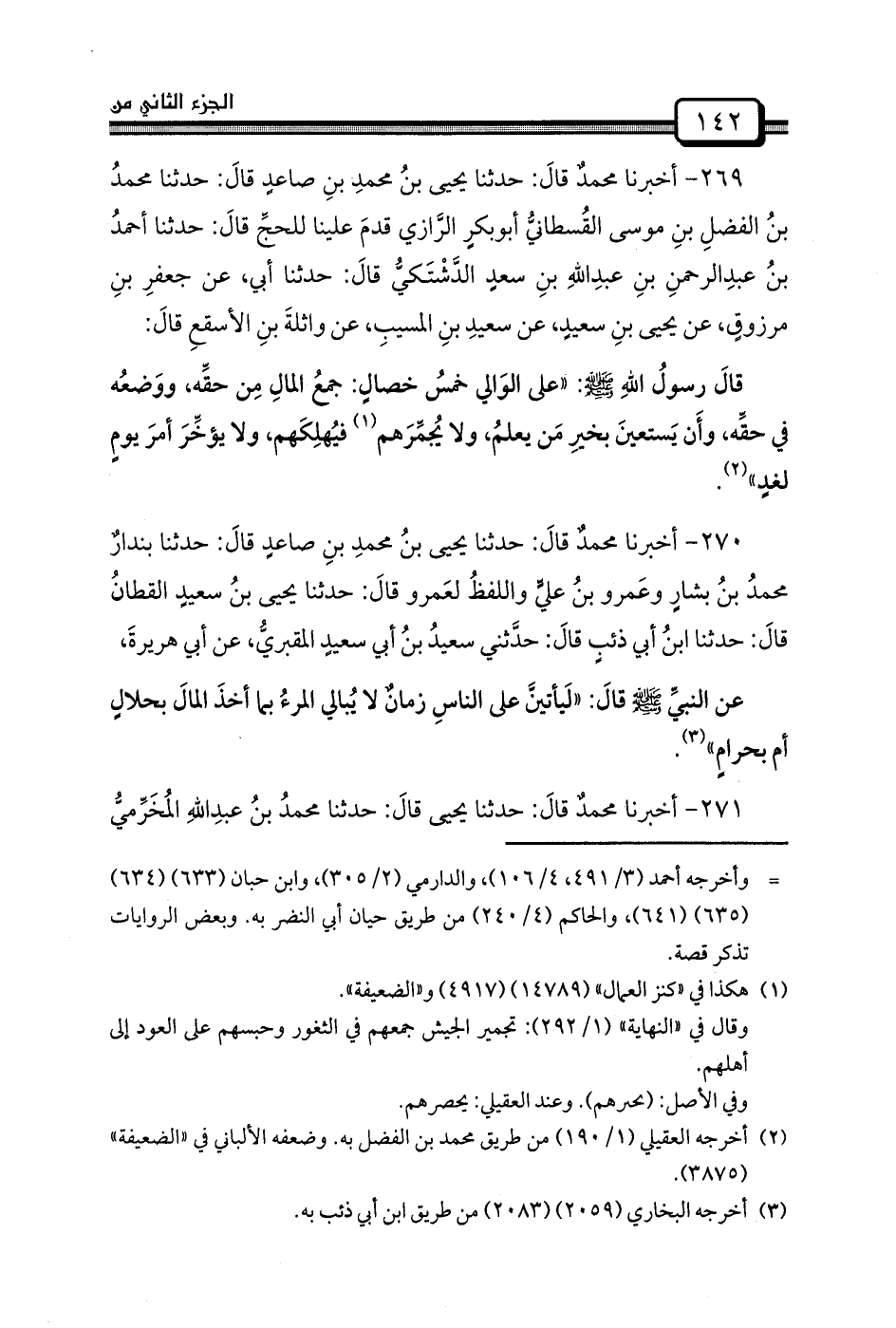 271 - أخبرنا محمدٌ قالَ: حدثنا يحيى قالَ: حدثنا محمدُ بنُ عبدِاللهِ المُخَرِّميُّ -[143]- قالَ: حَدَّثَنَا حسينُ بنُ محمدٍ قالَ: حَدَّثَنَا ابنُ أَبِي ذئبٍ، عَنِ المقبريِّ، عَنْ أبي هريرةَ قالَ: