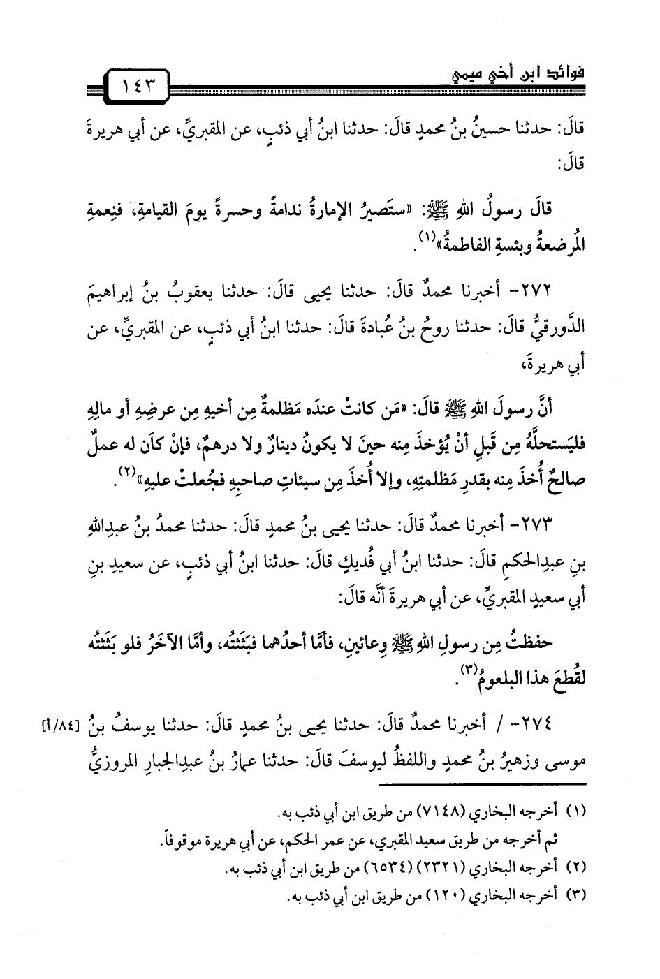 274 - / أخبرنا محمدٌ قالَ: حدثنا يحيى بنُ محمدٍ قالَ: حَدَّثَنَا يوسفُ بنُ مُوسَى وزهيرُ بنُ محمدٍ واللفظُ ليوسفَ قالَ: حَدَّثَنَا عمارُ بنُ عبدِالجبارِ المروزيُّ -[143]- قالَ: حَدَّثَنَا ابنُ أَبِي ذئبٍ، عَنْ سعيدٍ المقبريِّ، عن أبي هريرةَ،