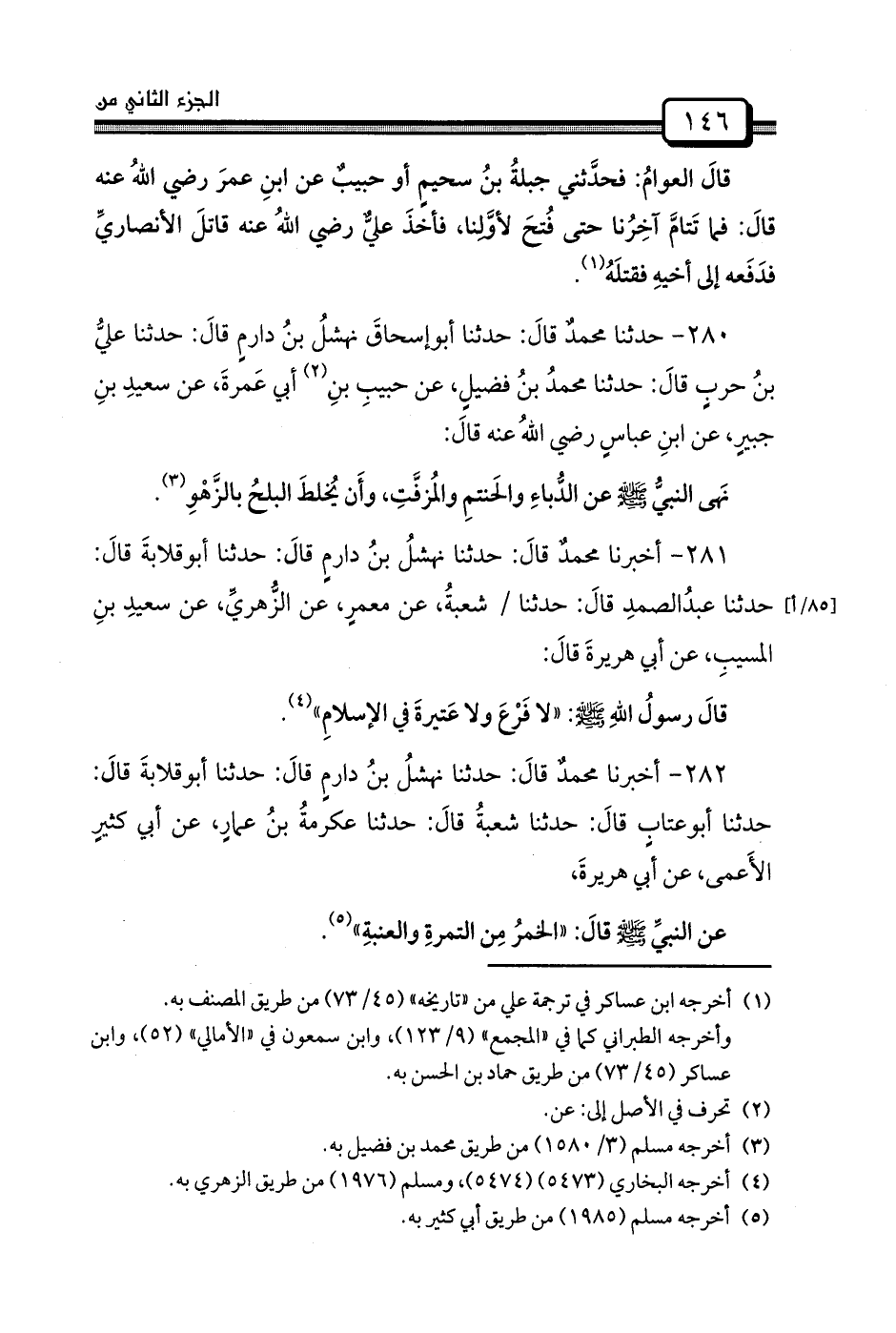 281 - أَخْبَرَنَا محمدٌ قالَ: حَدَّثَنَا نهشلُ بنُ دارمٍ قالَ: حدثنا أبوقلابةَ قالَ: حدثنا عبدُالصمدِ قالَ: حَدَّثَنَا / شعبةُ، عَنْ معمرٍ، عَنِ الزُّهريِّ، عَنْ سعيدِ بنِ المسيبِ، عَنْ أَبِي هريرةَ قالَ:
