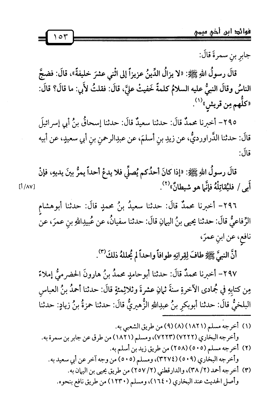 297 - أخبرنا محمدٌ قالَ: حدثنا أبوحامدٍ محمدُ بنُ هارونَ الحضرميُّ إِمْلاءً مِن كتابِهِ في جُمادى الآخرةِ سنةَ ثمانِ عشرةَ وثلاثِمئةٍ قالَ: حَدَّثَنَا أحمدُ بنُ العباسِ البلخيُّ قالَ: حدثنا أبوبكرِ بنُ عبدِاللهِ الزُّهيريُّ قالَ: حَدَّثَنَا حمزةُ بنُ زيادٍ: حَدَّثَنَا -[154]- شعبةُ، عن عُبيدِاللهِ بنِ عمرَ، عن نافعٍ عن ابنِ عمرَ،
