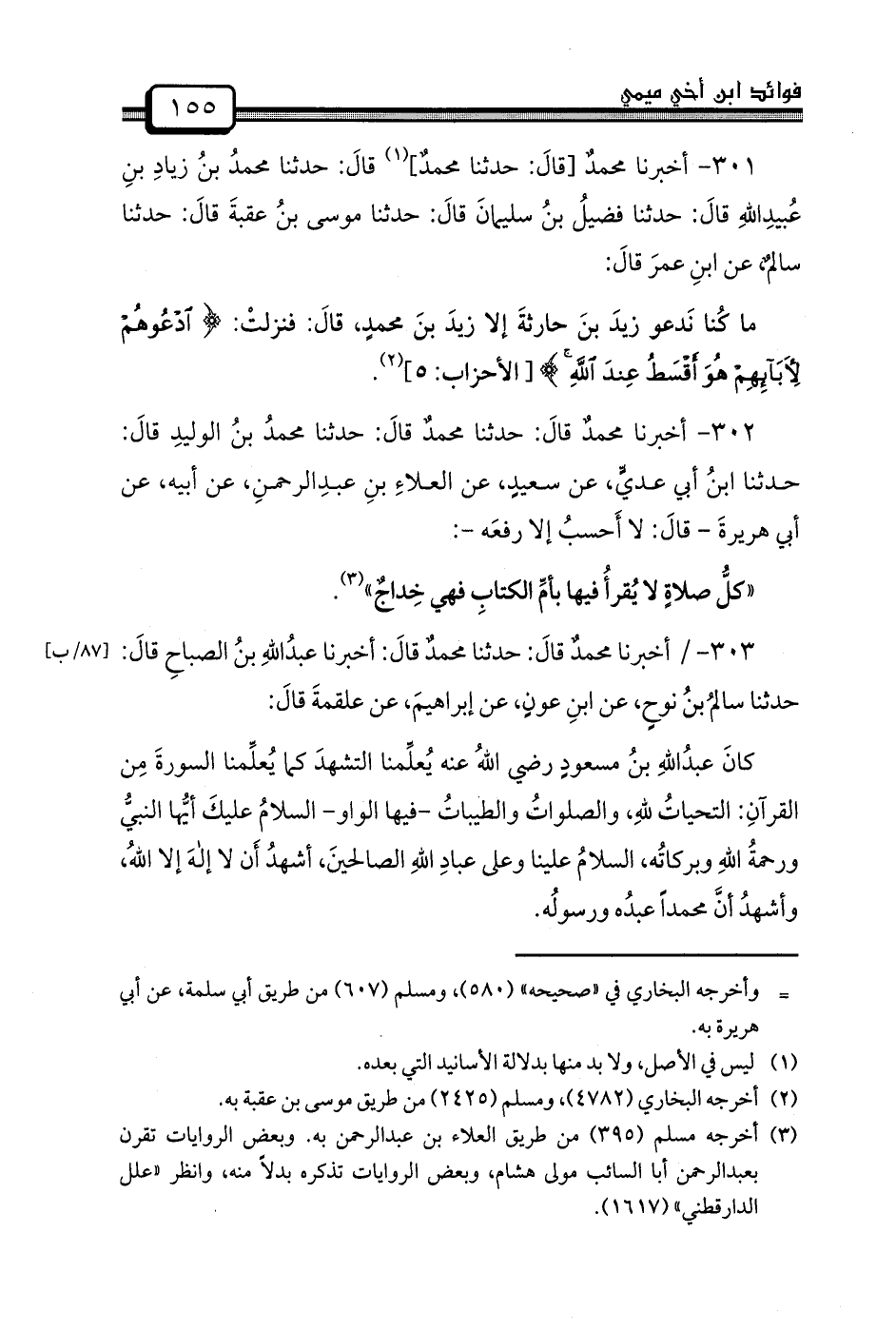 301 - أَخْبَرَنَا محمدٌ [قالَ: حَدَّثَنَا محمدٌ] قالَ: حَدَّثَنَا محمدُ بنُ زيادِ بنِ عُبيدِاللهِ قالَ: حَدَّثَنَا فضيلُ بنُ سليمانَ قالَ: حَدَّثَنَا مُوسَى بنُ عقبةَ قالَ: حَدَّثَنَا سالمٌ، عَنِ ابنِ عمرَ قالَ: