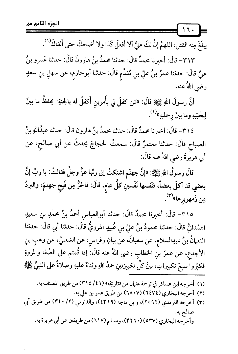 315 - قالَ: أخبرنا محمدٌ قالَ: حدثنا أبوالعباسِ أحمدُ بنُ محمدِ بنِ سعيدٍ الهمْدانيُّ قالَ: حَدَّثَنَا محمودُ بنُ عليِّ بنِ عُبيدٍ الهرويُّ قالَ: حَدَّثَنَا أَبِي قالَ: حَدَّثَنَا النعمانُ بنُ عبدِالسلامِ، عَنْ سفيانَ، عَنْ بيانٍ وفراسٍ، عَنِ الشعبيِّ، عَنْ وهبِ بنِ الأجدعِ، عَنْ عمرَ بنِ الخطابِ رَضِيَ اللهُ عَنْهُ قالَ: إِذَا قُمتم عَلَى الصَّفا والمروةِ فكبِّروا سبعَ تكبيراتٍ، بينَ كلِّ تكبيرَتينِ حمدُ اللهِ وثناءٌ عليهِ وصلاةٌ عَلَى النبيِّ صَلَّى اللَّهُ عَلَيْهِ وَسَلَّمَ -[161]- ومسألةٌ لنفسِكَ.