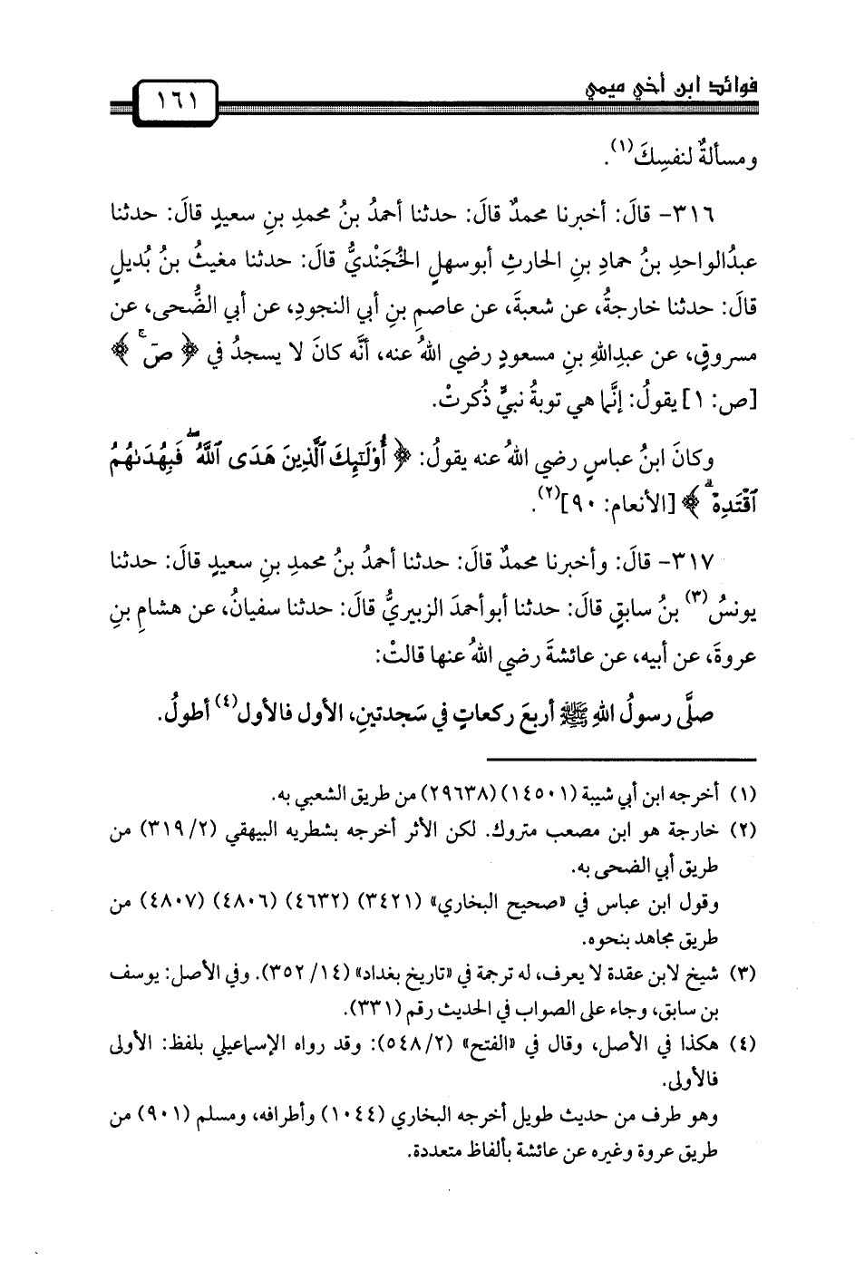 316 - قالَ: أَخْبَرَنَا محمدٌ قالَ: حَدَّثَنَا أحمدُ بنُ محمدِ بنِ سعيدٍ قالَ: حدثنا عبدُالواحدِ بنُ حمادِ بنِ الحارثِ أبوسهلٍ الخُجَنْديُّ قالَ: حَدَّثَنَا مغيثُ بنُ بُديلٍ قالَ: حدثنا خارجةُ، عن شعبةَ، عَنْ عاصمِ بنِ أَبِي النجودِ، عَنْ أَبِي الضُّحى، عن مسروقٍ، عن عبدِاللهِ بنِ مسعودٍ رَضِيَ اللهُ عَنْهُ، أنَّه كانَ لا يسجدُ في {ص} [ص: 1] يقولُ: إنَّما هِيَ توبةُ نبيٍّ ذُكرتْ.