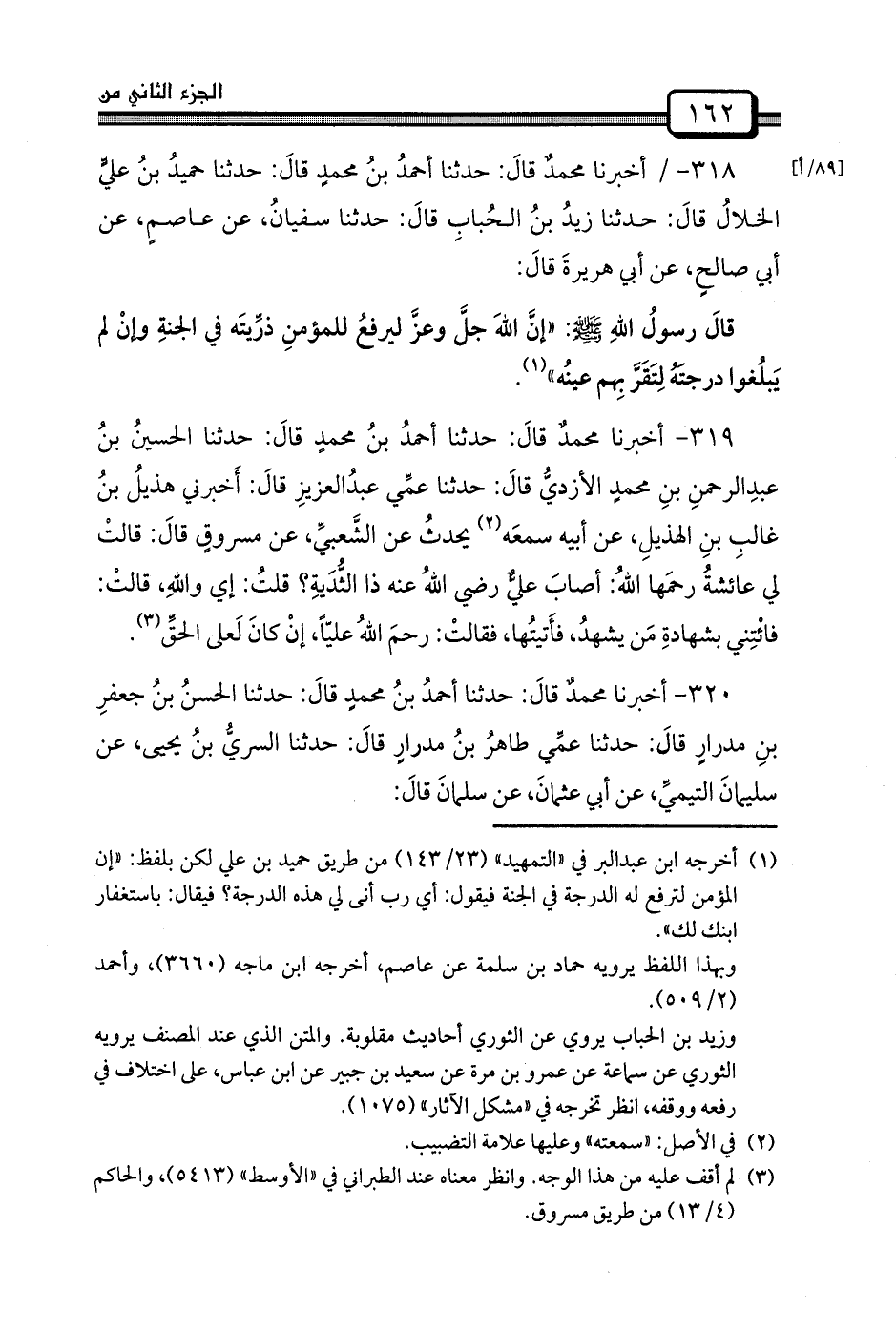 318 - / أَخْبَرَنَا محمدٌ قالَ: حَدَّثَنَا أحمدُ بنُ محمدٍ قالَ: حَدَّثَنَا حميدُ بنُ عليٍّ الخلالُ قالَ: حَدَّثَنَا زيدُ بنُ الحُبابِ قالَ: حَدَّثَنَا سفيانُ، عَنْ عاصمٍ، عَنْ أَبِي صالحٍ، عَنْ أبي هريرةَ قالَ: