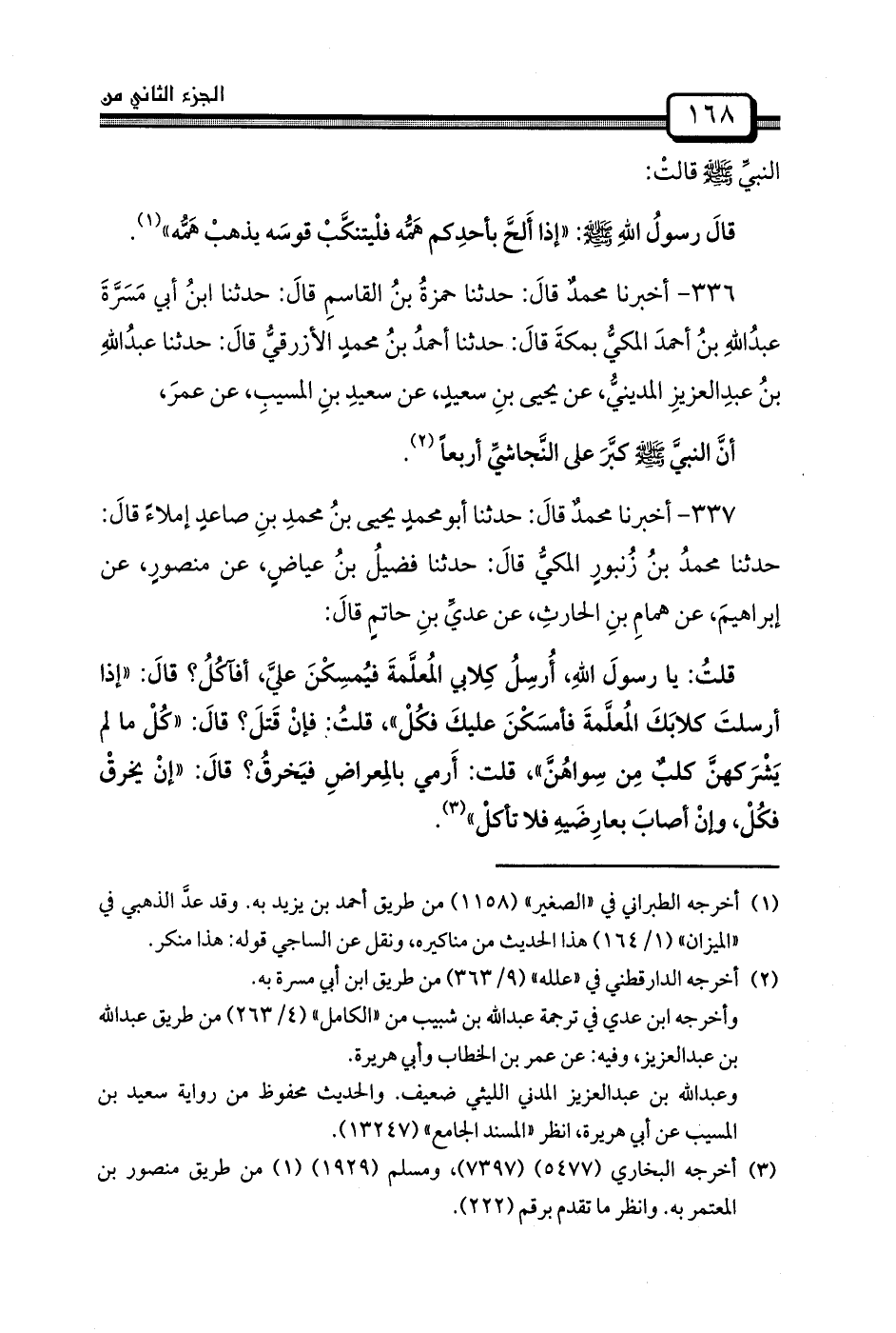337 - أخبرنا محمدٌ قالَ: حدثنا أبومحمدٍ يَحْيَى بنُ محمدِ بنِ صاعدٍ إِمْلاءً قالَ: حَدَّثَنَا محمدُ بنُ زُنبورٍ المكيُّ قالَ: حَدَّثَنَا فضيلُ بنُ عياضٍ، عَنْ منصورٍ، عَنْ إبراهيمَ، عَنْ همامِ بنِ الحارثِ، عَنْ عديِّ بنِ حاتمٍ قالَ: