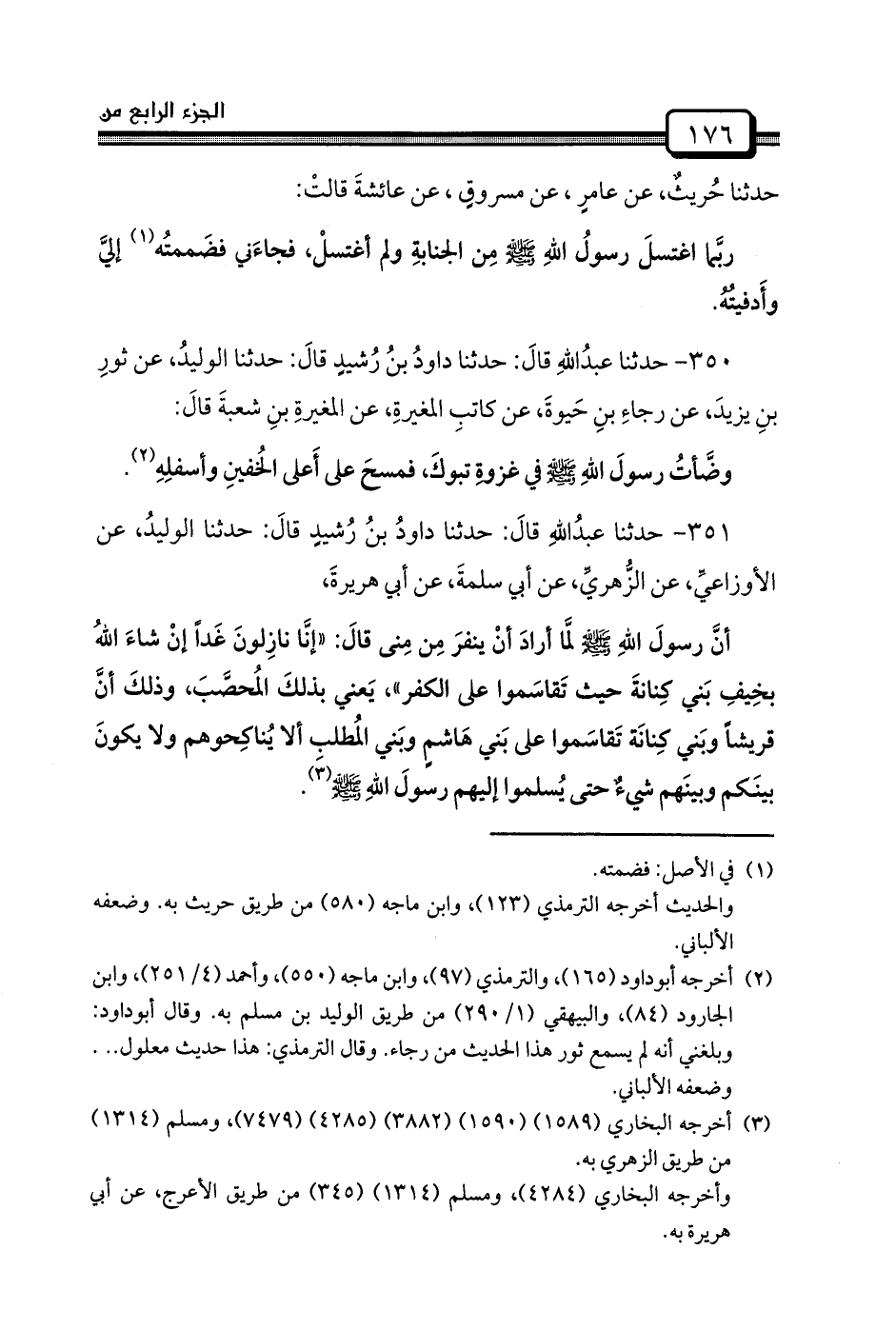 350 - حدثنا عبدُاللهِ قالَ: حَدَّثَنَا داودُ بنُ رُشيدٍ قالَ: حَدَّثَنَا الوليدُ، عَنْ ثورِ بنِ يزيدَ، عَنْ رجاءِ بنِ حَيوةَ، عَنْ كاتبِ المغيرةِ، عَنِ المغيرةِ بنِ شعبةَ قالَ: