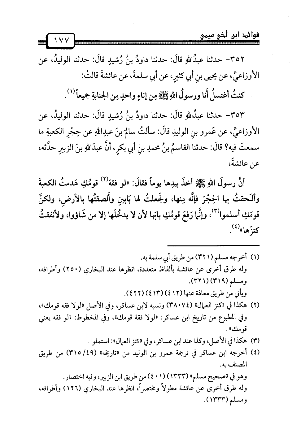 353 - حدثنا عبدُاللهِ قالَ: حَدَّثَنَا داودُ بنُ رُشيدٍ قالَ: حَدَّثَنَا الوليدُ، عَنِ الأوزاعيِّ، عَنْ عَمرو بنِ الوليدِ قالَ: سألتُ سالمَ بنَ عبدِاللهِ عَنْ حِجْرِ الكعبةِ مَا سمعتَ فِيهِ؟ قالَ: حَدَّثَنَا القاسمُ بنُ محمدِ بنِ أَبِي بكرٍ، أنَّ عبدَاللهِ بنَ الزبيرِ حدَّثه، عَنْ عائشةَ،