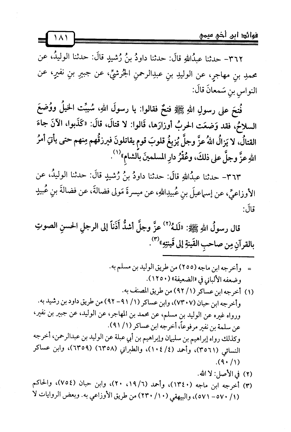 362 - حدثنا عبدُاللهِ قالَ: حَدَّثَنَا داودُ بنُ رُشيدٍ قالَ: حَدَّثَنَا الوليدُ، عَنْ محمدِ بنِ مهاجرٍ، عَنِ الوليدِ بنِ عبدِالرحمنِ الجُرشيِّ، عَنْ جبيرِ بنِ نفيرٍ، عَنِ النواسِ بنِ سَمعانَ قالَ: