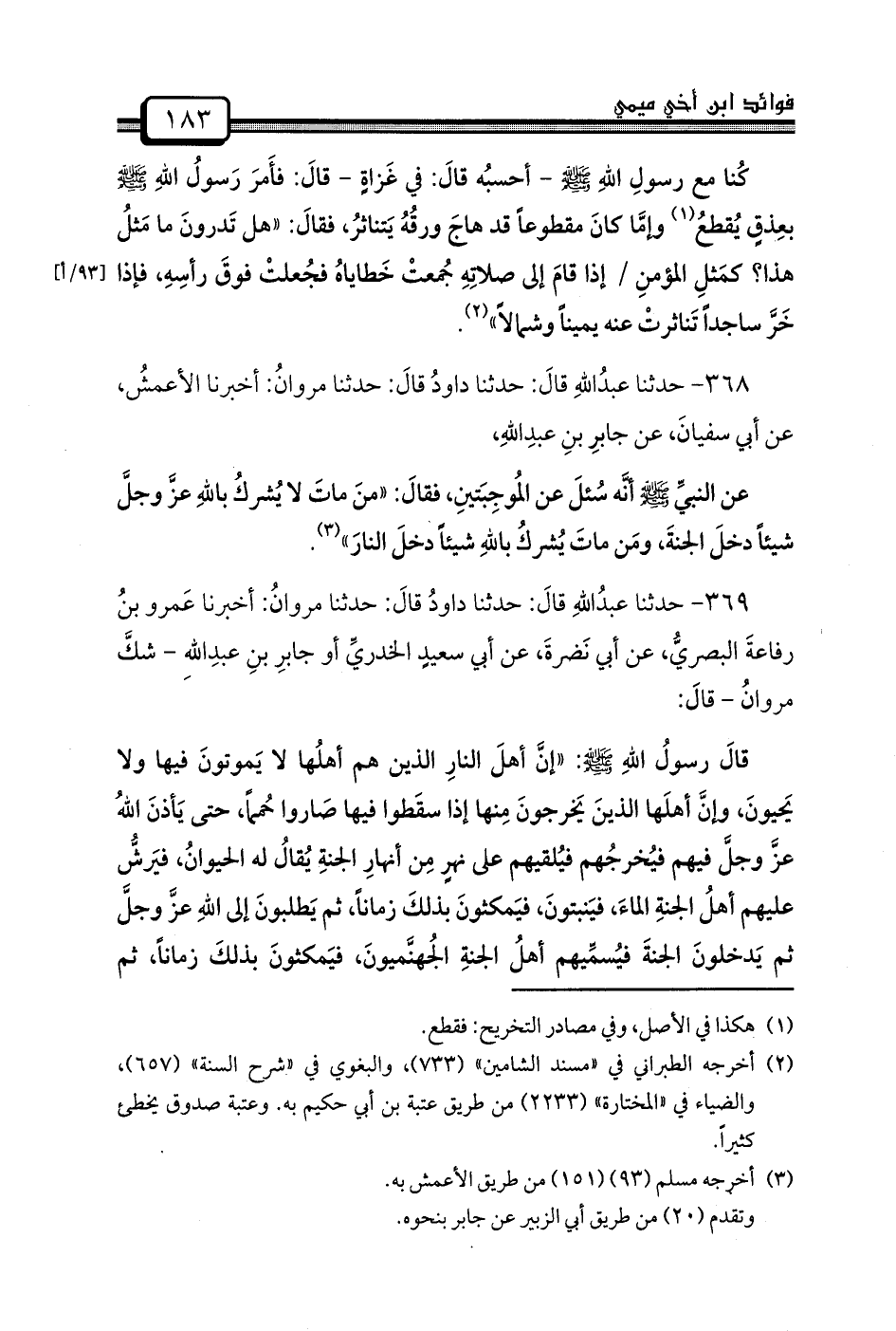 قالَ رسولُ اللهِ صَلَّى اللَّهُ عَلَيْهِ وَسَلَّمَ: "إنَّ أهلَ النارِ الَّذِينَ هُمْ أهلُها لا يَموتونَ فِيهَا وَلا يَحيونَ، وإنَّ أهلَها الذينَ يَخرجونَ مِنها إِذَا سقَطوا فِيهَا صَاروا حُمماً، حَتَّى يَأذنَ اللهُ عزَّ وجلَّ فِيهِمْ فيُخرجُهم فيُلقيهم عَلَى نهرٍ مِن أنهارِ الجنةِ يُقالُ لَهُ الحيوانُ، فيَرشُّ عَلَيْهِمْ أهلُ الجنةِ الماءَ، فيَنبتونَ، فيَمكثونَ بذلكَ زَمَانًا، ثُمَّ يَطلبونَ إِلَى اللهِ عزَّ وجلَّ ثُمَّ يَدخلونَ الجنةَ فيُسمِّيهم أهلُ الجنةِ الجُهنَّميونَ، فيَمكثونَ بذلكَ زَمَانًا، ثُمَّ -[184]- يَطلبونَ إِلَى اللهِ عزَّ وجلَّ فيُمحى عَنْهُمْ ذلكَ الاسمُ، فيَلحقونَ بأهلِ الجنةِ".