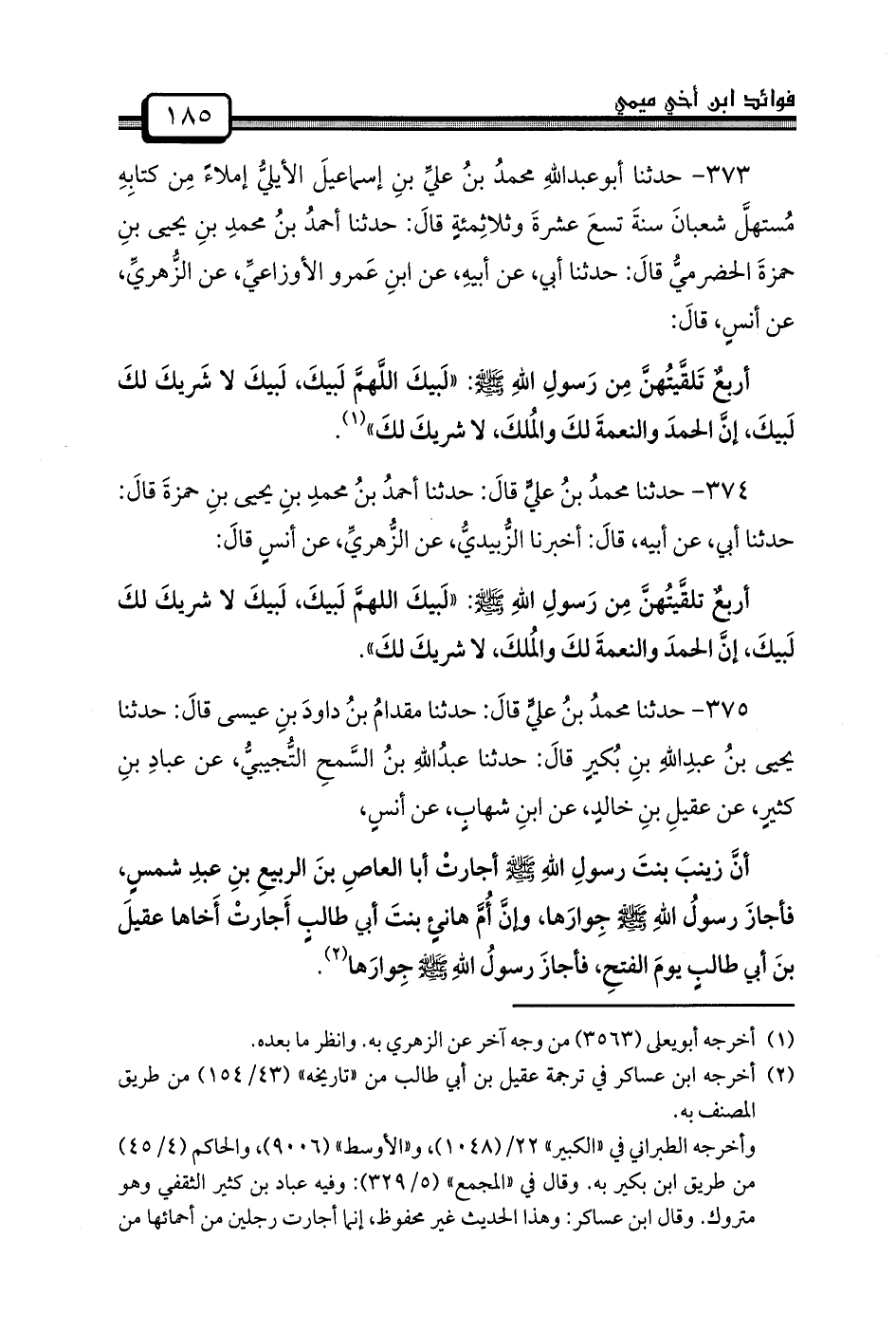 373 - حدثنا أبوعبد اللهِ محمدُ بنُ عليِّ بنِ إسماعيلَ الأيليُّ إِمْلاءً مِن كتابِهِ مُستهلَّ شعبانَ سنةَ تسعَ عشرةَ وثلاثِمئةٍ قالَ: حَدَّثَنَا أحمدُ بنُ محمدِ بنِ يَحْيَى بنِ حمزةَ الحضرميُّ قالَ: حَدَّثَنَا أَبِي، عَنْ أبيهِ، عن أبي عَمرو الأوزاعيِّ، عَنِ الزُّهريِّ، عَنْ أنسٍ، قالَ: