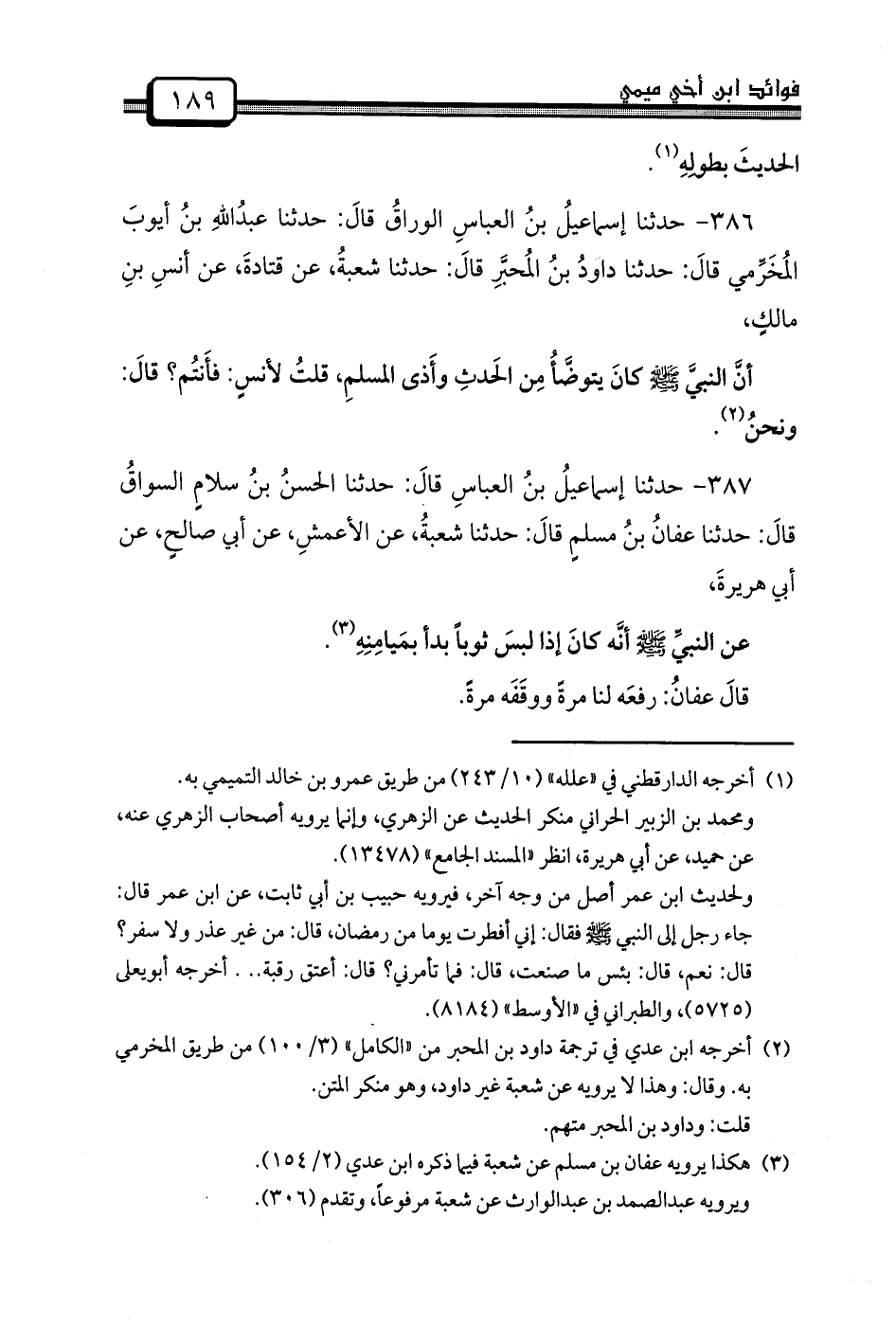 386 - حَدَّثَنَا إسماعيلُ بنُ العباسِ الوراقُ قالَ: حَدَّثَنَا عبدُاللهِ بنُ أيوبَ المُخَرِّمي قالَ: حَدَّثَنَا داودُ بنُ المُحبَّرِ قالَ: حَدَّثَنَا شعبةُ، عَنْ قتادةَ، عَنْ أنسِ بنِ مالكٍ،