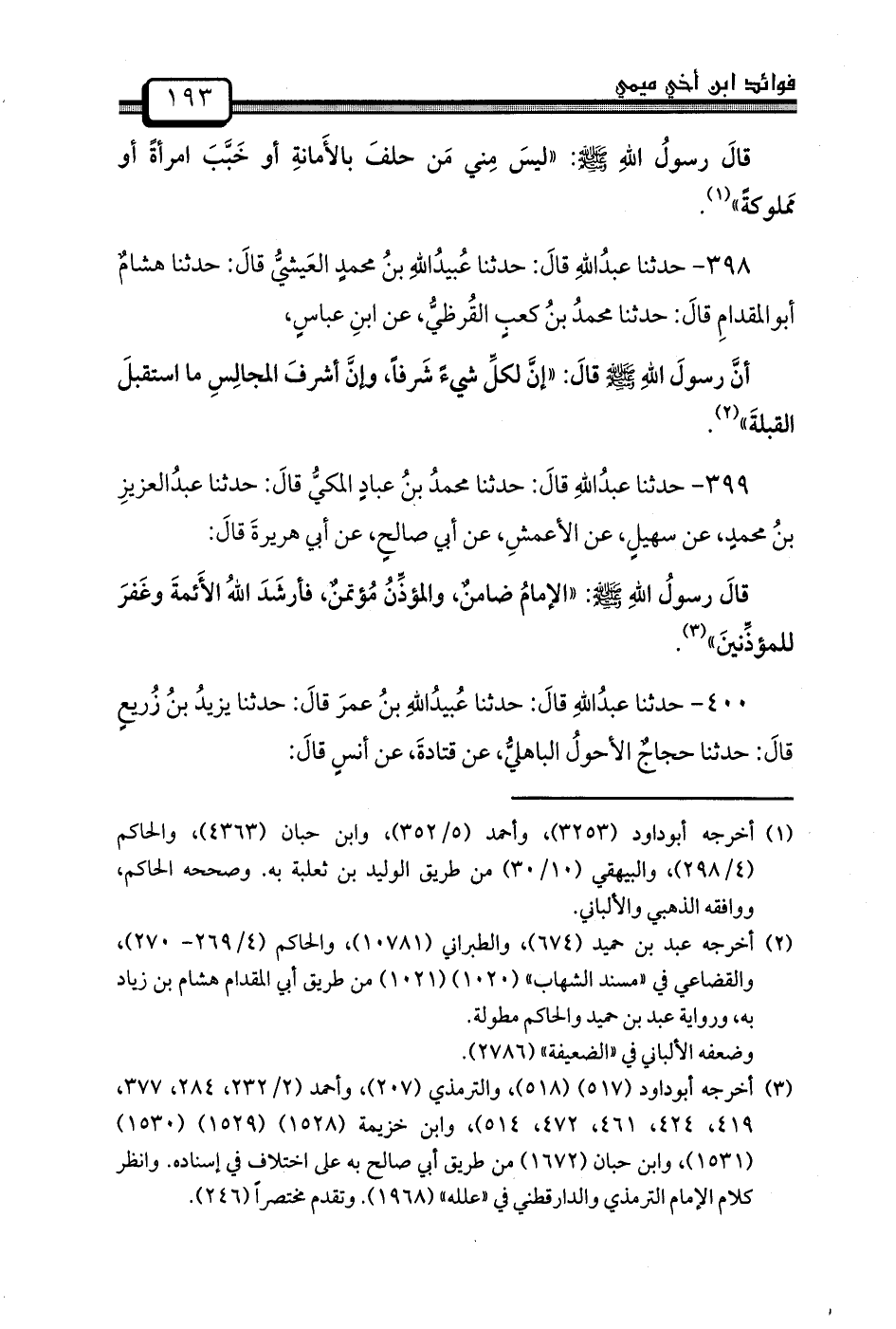 399 - حدثنا عبدُاللهِ قالَ: حَدَّثَنَا محمدُ بنُ عبادٍ المكيُّ قالَ: حدثنا عبدُالعزيزِ بنُ محمدٍ، عَنْ سهيلٍ، عَنِ الأعمشِ، عَنْ أَبِي صالحٍ، عَنْ أَبِي هريرةَ قالَ: