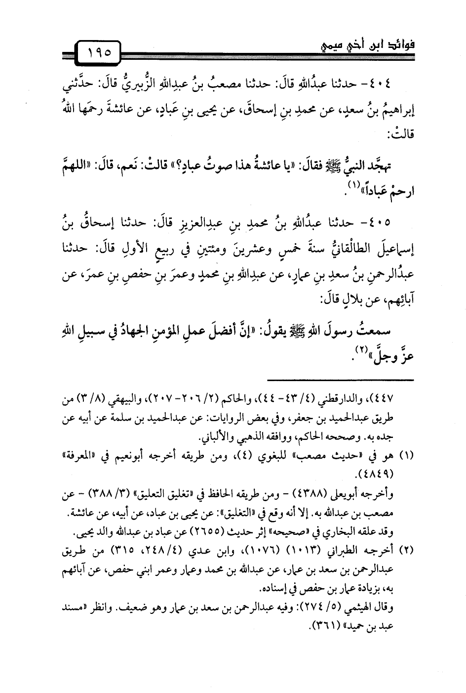 404 - حدثنا عبدُاللهِ قالَ: حدثنا مصعبُ بنُ عبدِاللهِ الزُّبيريُّ قالَ: حدَّثني إبراهيمُ بنُ سعدٍ، عَنْ محمدِ بنِ إسحاقَ، عَنْ يَحْيَى بنِ عَبادٍ، عَنْ عائشةَ رحمَها اللهُ قالتْ:
