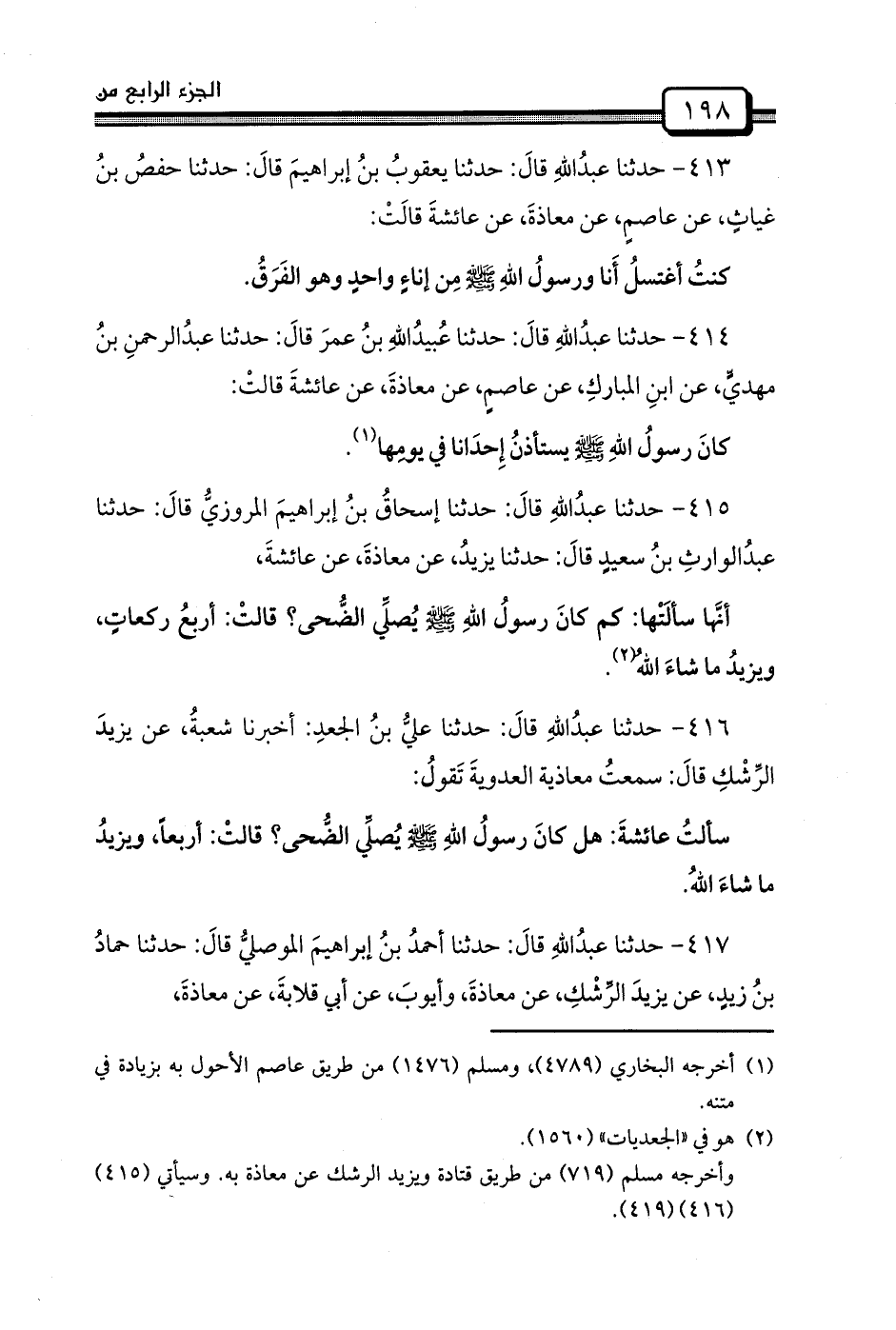 417 - حدثنا عبدُاللهِ قالَ: حَدَّثَنَا أحمدُ بنُ إبراهيمَ الموصليُّ قالَ: حَدَّثَنَا حمادُ بنُ زيدٍ، عَنْ يزيدَ الرِّشْكِ، عَنْ معاذةَ، وأيوبَ، عَنْ أَبِي قلابةَ، عَنْ معاذةَ،