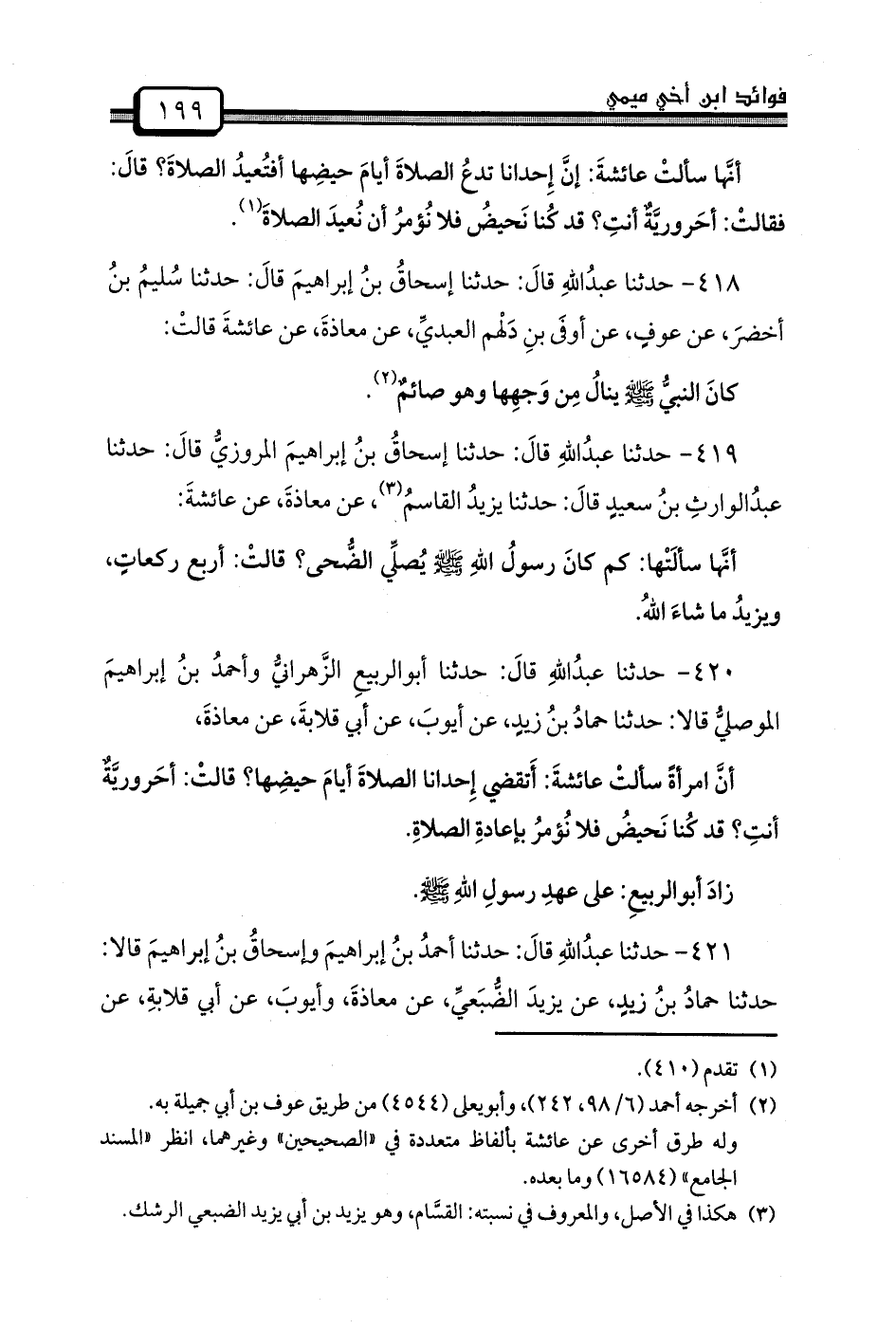 420 - حدثنا عبدُاللهِ قالَ: حدثنا أبوالربيعِ الزَّهرانيُّ وأحمدُ بنُ إبراهيمَ الموصليُّ قَالا: حَدَّثَنَا حمادُ بنُ زيدٍ، عَنْ أيوبَ، عَنْ أَبِي قلابةَ، عَنْ معاذةَ،