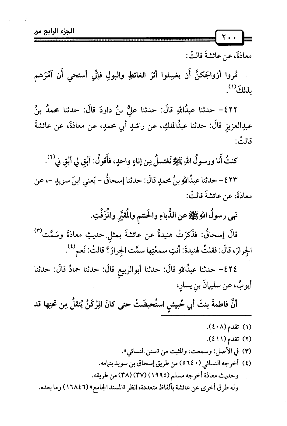 قالَ إسحاقُ: فذَكرَتْ هنيدةُ عَنْ عائشةَ بمثلِ حديثِ معاذةَ وسَمَّت الجِرارَ، قالَ: فقلتُ لهنيدةَ: أنتِ سمعْتِها سمَّت الجِرارَ؟ قالتْ: نَعم.