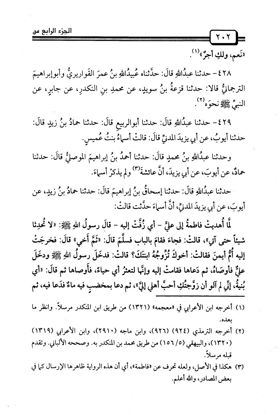 429 - حدثنا عبدُاللهِ قالَ: حدثنا أبوالربيعِ قالَ: حَدَّثَنَا حمادُ بنُ زيدٍ قالَ: حَدَّثَنَا أيوبُ، عَنْ أَبِي يزيدَ المدنيِّ قالَ: قالتْ أسماءُ بنتُ عُميسٍ.