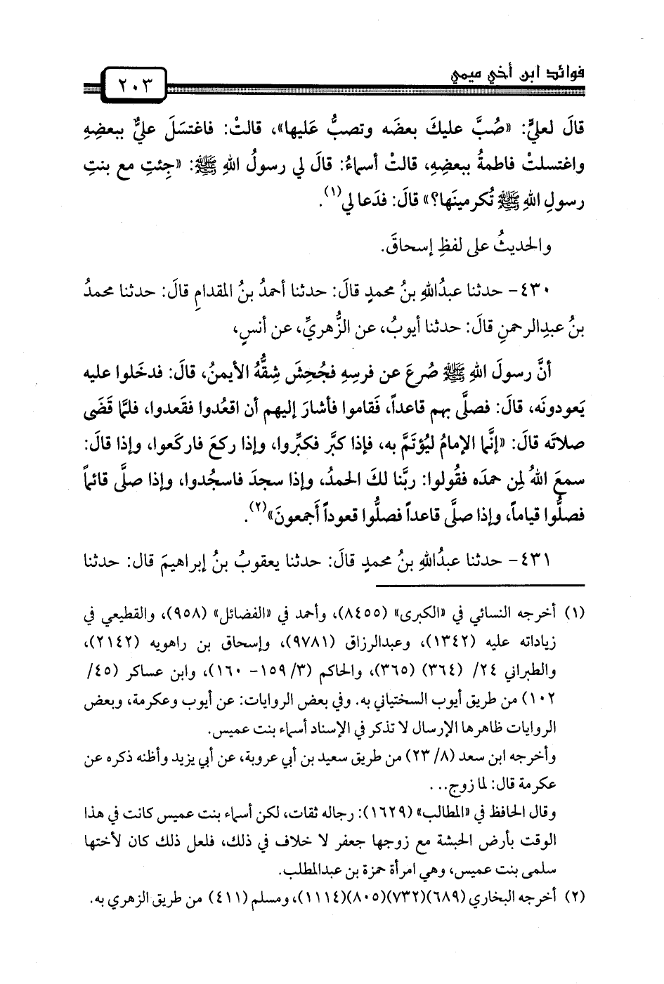 430 - حدثنا عبدُاللهِ بنُ محمدٍ قالَ: حَدَّثَنَا أحمدُ بنُ المقدامِ قالَ: حدثنا محمدُ بنُ عبدِالرحمنِ قالَ: حَدَّثَنَا أيوبُ، عَنِ الزُّهريِّ، عَنْ أنسٍ،