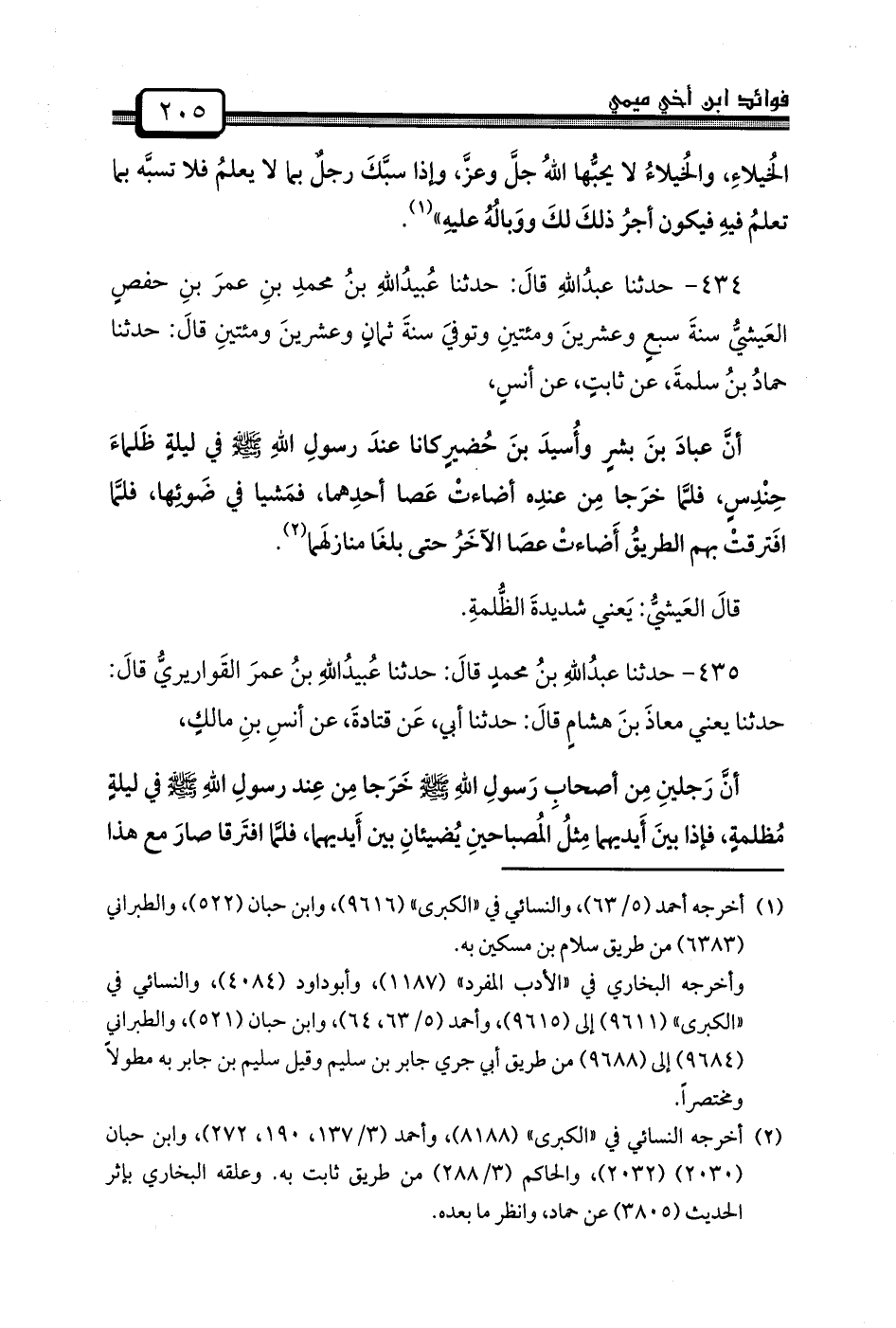 أنَّ رَجلينِ مِن أصحابِ رَسولِ اللهِ صلى الله عليه وسلم خَرَجا مِن عِند رسولِ اللهِ صَلَّى اللَّهُ عَلَيْهِ وَسَلَّمَ فِي ليلةٍ مُظلمةٍ، فَإِذَا بينَ أَيديهما مِثلُ المُصباحينِ يُضيئانِ بَيْنَ أَيديهما، فلمَّا افتَرقا صارَ مَعَ هَذَا -[206]- واحدٌ ومَع هَذَا واحدٌ حتى أتَى أهلَه.
