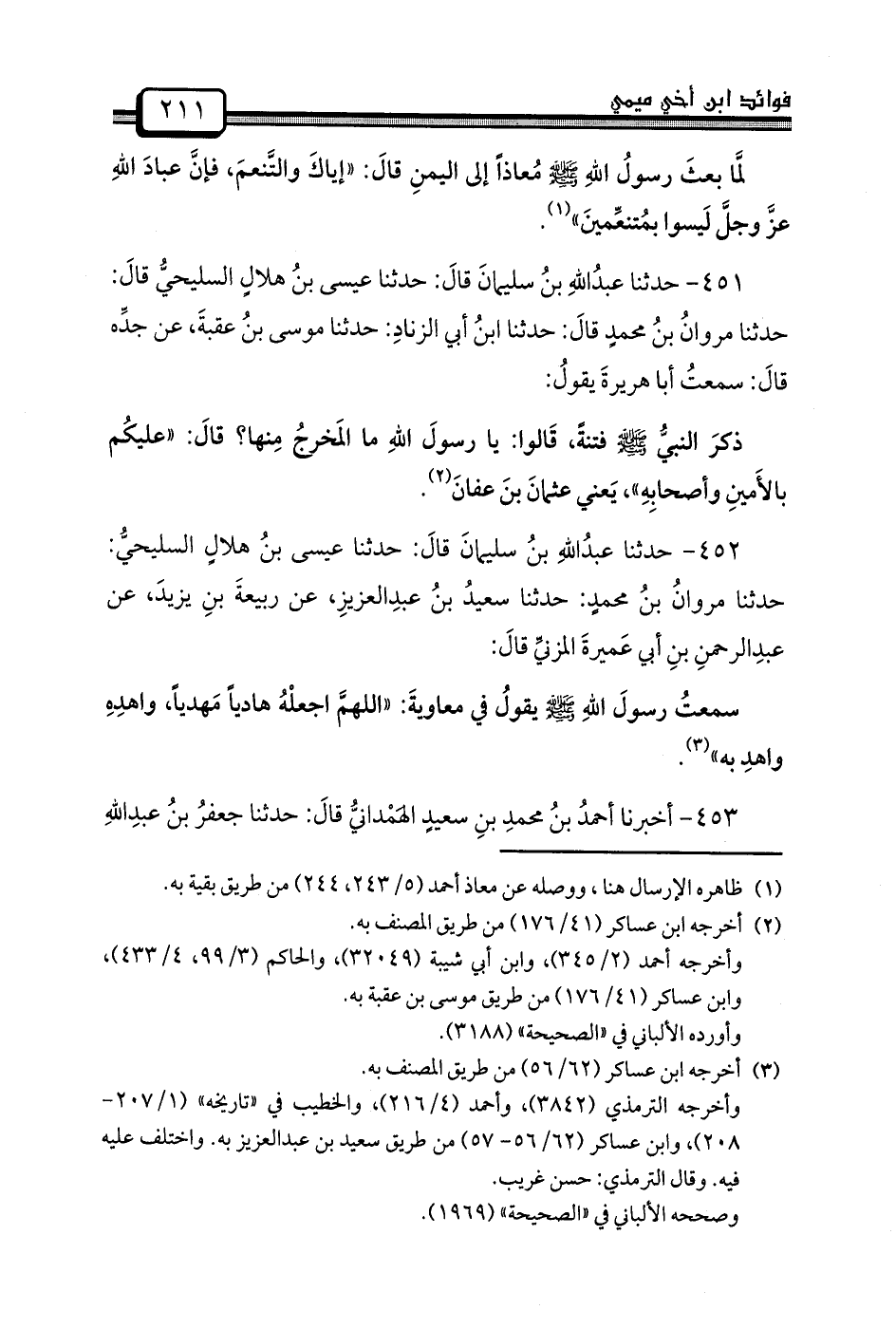 452 - حدثنا عبدُاللهِ بنُ سليمانَ قالَ: حَدَّثَنَا عِيسَى بنُ هلالٍ السليحيُّ: حَدَّثَنَا مروانُ بنُ محمدٍ: حَدَّثَنَا سعيدُ بنُ عبدِالعزيزِ، عن ربيعةَ بنِ يزيدَ، عن عبدِالرحمنِ بنِ أَبِي عَميرةَ المزنيِّ قالَ: