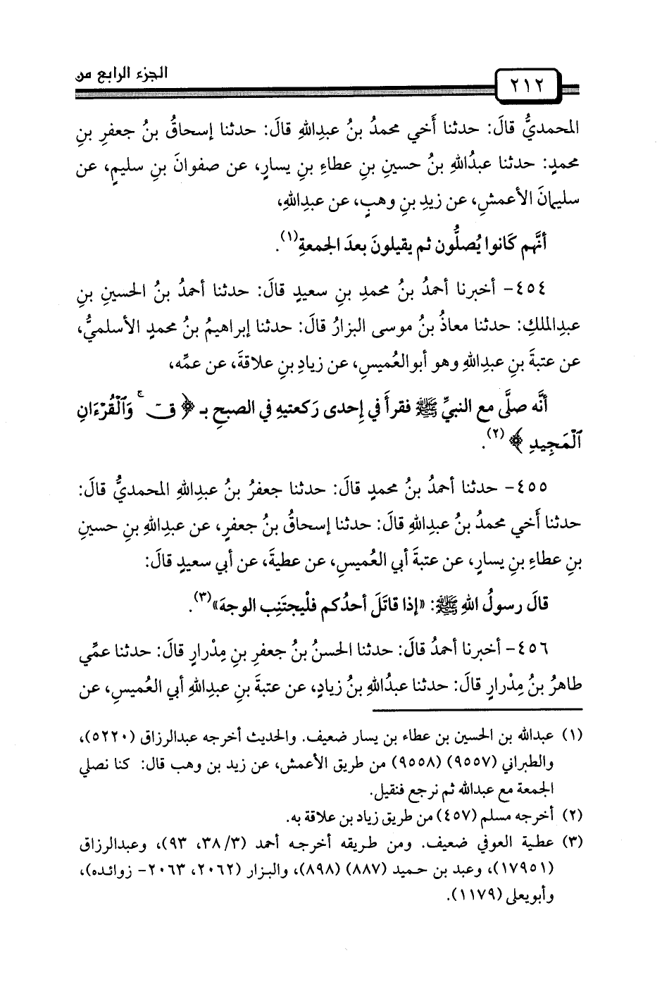 454 - أَخْبَرَنَا أحمدُ بنُ محمدِ بنِ سعيدٍ قالَ: حدثنا أحمدُ بنُ الحسينِ بنِ عبدِالملكِ: حَدَّثَنَا معاذُ بنُ مُوسَى البزارُ قالَ: حَدَّثَنَا إبراهيمُ بنُ محمدٍ الأسلميُّ، عَنْ عتبةَ بنِ عبدِاللهِ وهو أبوالعُميسِ، عَنْ زيادِ بنِ علاقةَ، عَنْ عمِّه،