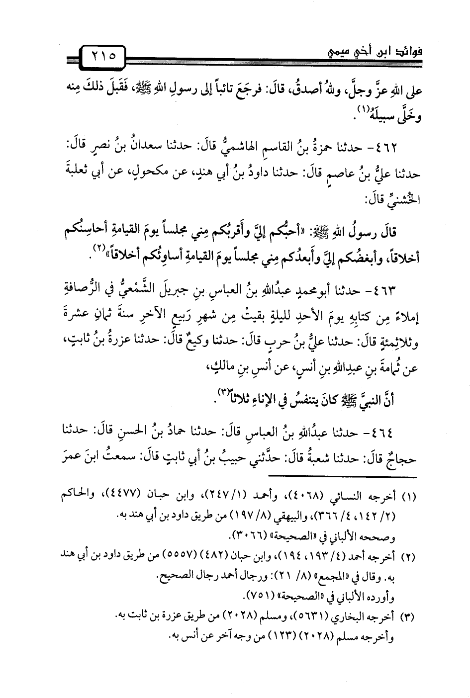 463 - حدثنا أبومحمدٍ عبدُاللهِ بنُ العباسِ بنِ جبريلَ الشَّمْعيُّ فِي الرُّصافةِ إِمْلاءً مِن كتابِهِ يومَ الأحدِ لليلةٍ بقيتْ مِن شهرِ رَبيعٍ الآخرِ سنةَ ثمانِ عشرةَ وثلاثِمئةٍ قالَ: حَدَّثَنَا عليُّ بنُ حربٍ قالَ: حَدَّثَنَا وكيعٌ قالَ: حَدَّثَنَا عزرةُ بنُ ثابتٍ، عَنْ ثُمامةَ بنِ عبدِاللهِ بنِ أنسٍ، عَنْ أنسِ بنِ مالكٍ،