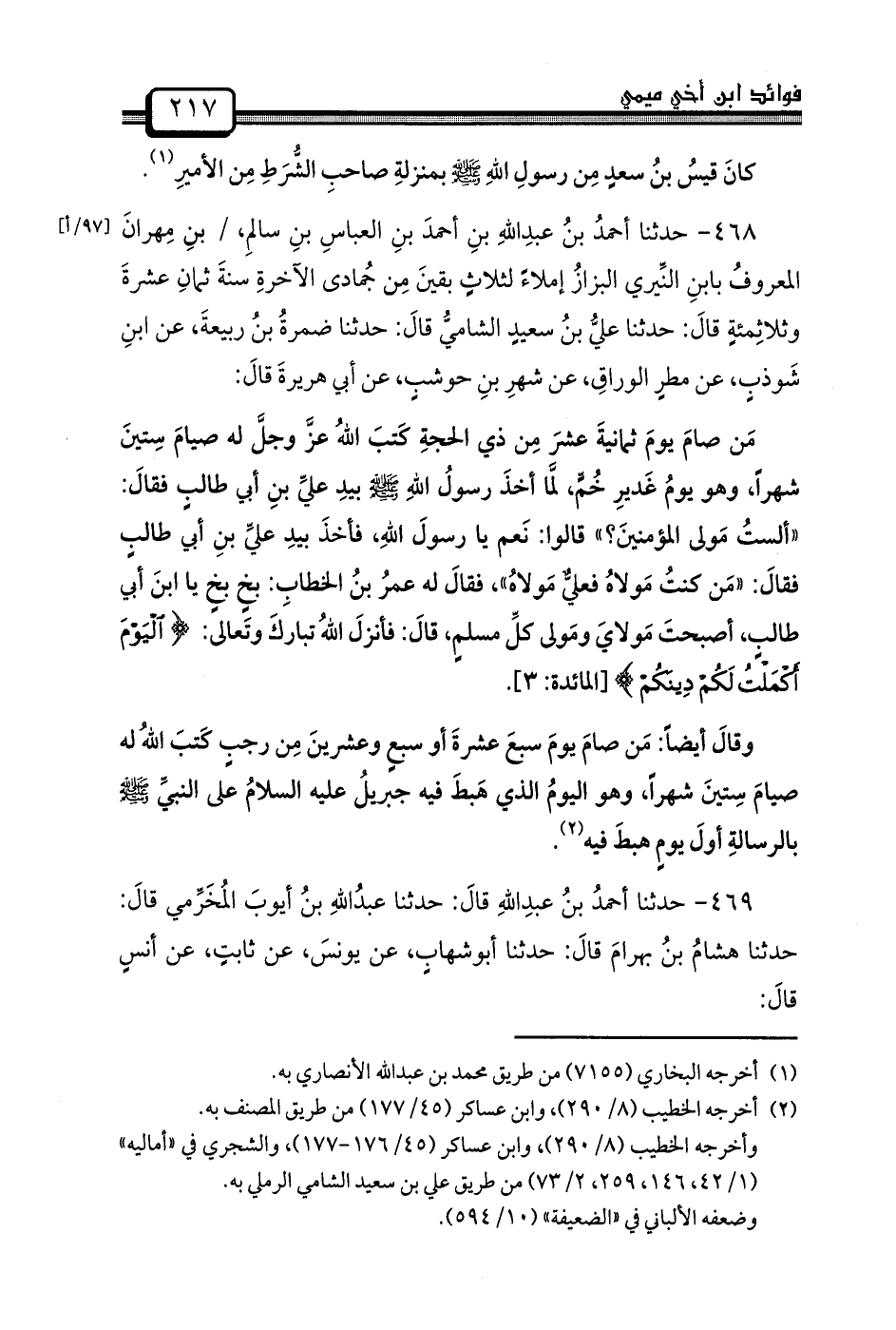 مَن صامَ يومَ ثمانيةَ عشرَ مِن ذِي الحجةِ كَتبَ اللهُ عزَّ وجلَّ لَهُ صيامَ سِتينَ شَهْرًا، وَهُوَ يومُ غَديرِ خُمٍّ، لمَّا أخذَ رسولُ اللهِ صَلَّى اللَّهُ عَلَيْهِ وَسَلَّمَ بيدِ عليِّ بنِ أَبِي طالبٍ فقالَ: "ألستُ مَولى المؤمنينَ؟ " قَالُوا: نَعم يَا رسولَ اللهِ، فأخذَ بيدِ عليِّ بنِ أَبِي طالبٍ فقالَ: "مَن كنتُ مَولاهُ فعليٌّ مَولاهُ"، فقالَ لَهُ عمرُ بنُ الخطابِ: بخٍ بخٍ يا ابنَ أَبِي طالبٍ، أصبحتَ مَولايَ ومَولى كلِّ مسلمٍ، قالَ: فأنزلَ اللهُ تباركَ وتَعالى: {الْيَوْمَ أَكْمَلْتُ لَكُمْ دِينَكُمْ} [المائدة: 3].