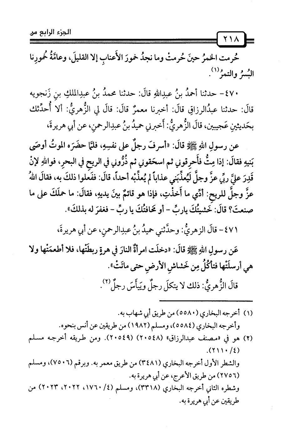 470 - حدثنا أحمدُ بنُ عبدِاللهِ قالَ: حدثنا محمدُ بنُ عبدِالملكِ بنِ زَنجويه قالَ: حدثنا عبدُالرزاقِ قالَ: أَخْبَرَنَا معمرٌ قالَ: قالَ لِي الزُّهريُّ: أَلا أُحدِّثك بحَديثينِ عَجيبين، قالَ الزُّهريُّ: أَخبرني حميدُ بنُ عبدِالرحمنِ، عَنْ أَبِي هريرةَ،