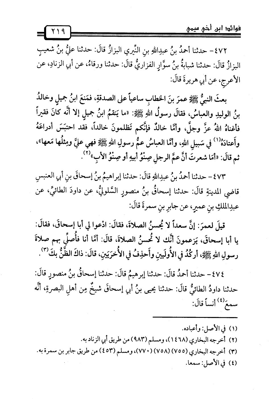 473 - حدثنا أحمدُ بنُ عبدِاللهِ قالَ: حَدَّثَنَا إبراهيمُ بنُ إسحاقَ بنِ أَبِي العنبسِ قَاضِي المدينةِ قالَ: حَدَّثَنَا إسحاقُ بنُ منصورٍ السَّلوليُّ، عن داودَ الطائيِّ، عن عبدِالملكِ بنِ عميرٍ، عَنْ جابرِ بنِ سمرةَ قالَ: