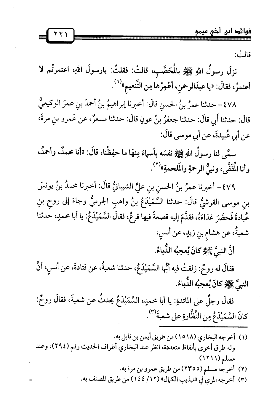 479 - أَخْبَرَنَا عمرُ بنُ الحسنِ بنِ عليٍّ الشيبانيُّ قالَ: أَخْبَرَنَا محمدُ بنُ يونسَ بنِ مُوسَى القرشيُّ قالَ: حَدَّثَنَا السَّمَيْدَعُ بنُ واهبٍ الجرميُّ وجاءَ إلى روحِ بنِ عُبادةَ فَحضَرَ غداءَهُ، فقدَّمَ إِلَيْهِ قَصْعَةً فِيهَا قرعٌ، فقالَ السَّمَيْدَعُ: يَا أَبَا محمدٍ، حَدَّثَنَا شعبةُ، عَنْ هشامِ بنِ زيدٍ، عَنْ أنسٍ،