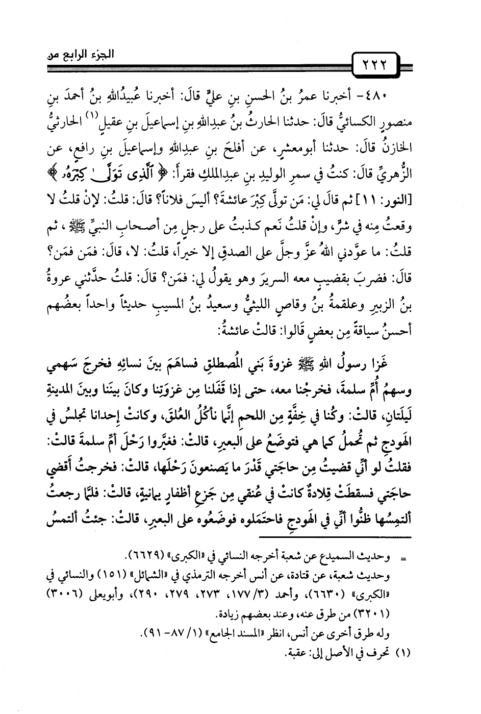 غَزا رسولُ اللهِ صَلَّى اللَّهُ عَلَيْهِ وَسَلَّمَ غزوةَ بَني المُصطلقِ فساهَمَ بينَ نسائِهِ فخرجَ سَهمي وسهمُ أُمِّ سلمةَ، فخرجْنا مَعَهُ، حَتَّى إِذَا قَفَلنا مِن غزوَتِنا وكانَ بينَنا وبينَ المدينةِ لَيلَتانِ، قالتْ: وكُنا فِي خِفَّةٍ مِن اللحمِ إنَّما نأكُلُ العُلقَ، وكانتْ إِحدانا تجلسُ فِي الهَودجِ ثُمَّ تُحملُ كَمَا هِيَ فتوضَعُ عَلَى البعيرِ، قالتْ: فغيَّروا رَحْلَ أمِّ سلمةَ قالتْ: فقلتُ لَوْ أنِّي قضيتُ مِن حاجَتي قَدْرَ مَا يَصنعونَ رَحْلَها، قالتْ: فخرجتُ أَقضي حاجَتي فسقطَتْ قِلادةٌ كانتْ فِي عُنقي مِن جَزعِ أظفارٍ يمانيةٍ، قالتْ: فلمَّا رجعتُ ألتمِسُها ظنُّوا أنِّي فِي الهَودجِ فاحتَمَلوه فوضَعُوه عَلَى البعيرِ، قالتْ: جئتُ ألتمسُ -[223]- فَإِذَا هُمْ قَدْ ذهَبوا، قالتْ: قلتُ: مَا أجدُ شَيْئًا خَيْرًا مِن أَن أَضطجِعَ فِي مَضجعي لعلَّهم يَلتمِسوني إِذَا فَقَدوني.
