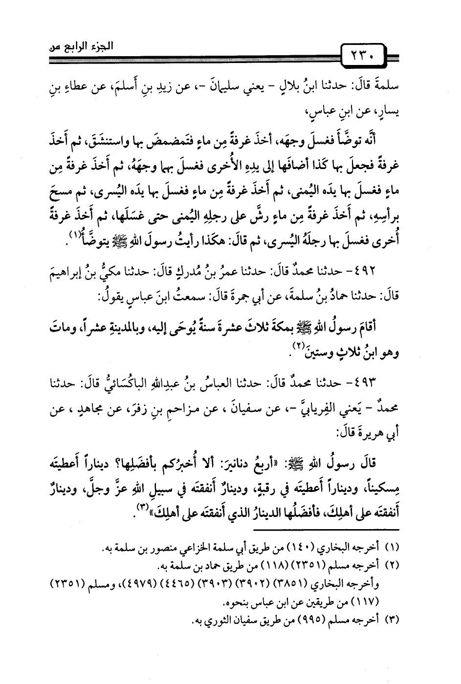 قالَ رسولُ اللهِ صَلَّى اللَّهُ عَلَيْهِ وَسَلَّمَ: "أربعُ دنانيرَ: أَلا أُخبرُكم بأفضَلِها؟ ديناراً أَعطيتَه مِسكيناً، وديناراً أَعطيتَه فِي رقبةٍ، ودينارٌ أَنفقتَه فِي سبيلِ اللهِ عزَّ وجلَّ، ودينارٌ أَنفقتَه عَلَى أهلِكَ، فأفضَلُها الدينارُ الَّذِي أَنفقتَه عَلَى أهلِكَ".