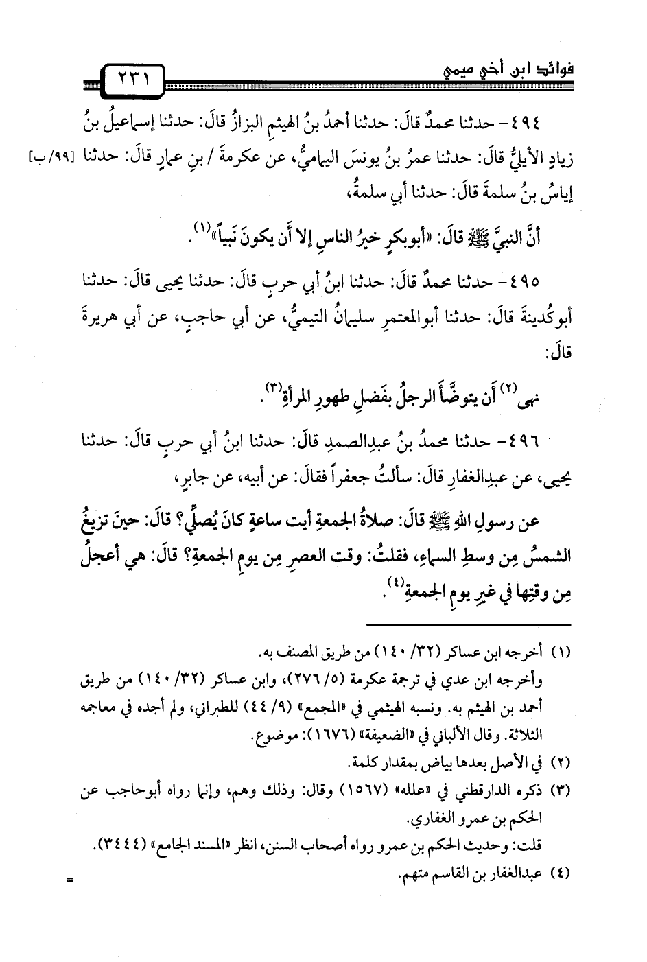 496 - حدثنا محمدُ بنُ عبدِالصمدِ قالَ: حَدَّثَنَا ابنُ أَبِي حربٍ قالَ: حَدَّثَنَا يحيى، عن عبدِالغفارِ قالَ: سألتُ جَعْفَرًا فقالَ: عَنْ أَبِيهِ، عَنْ جابرٍ،