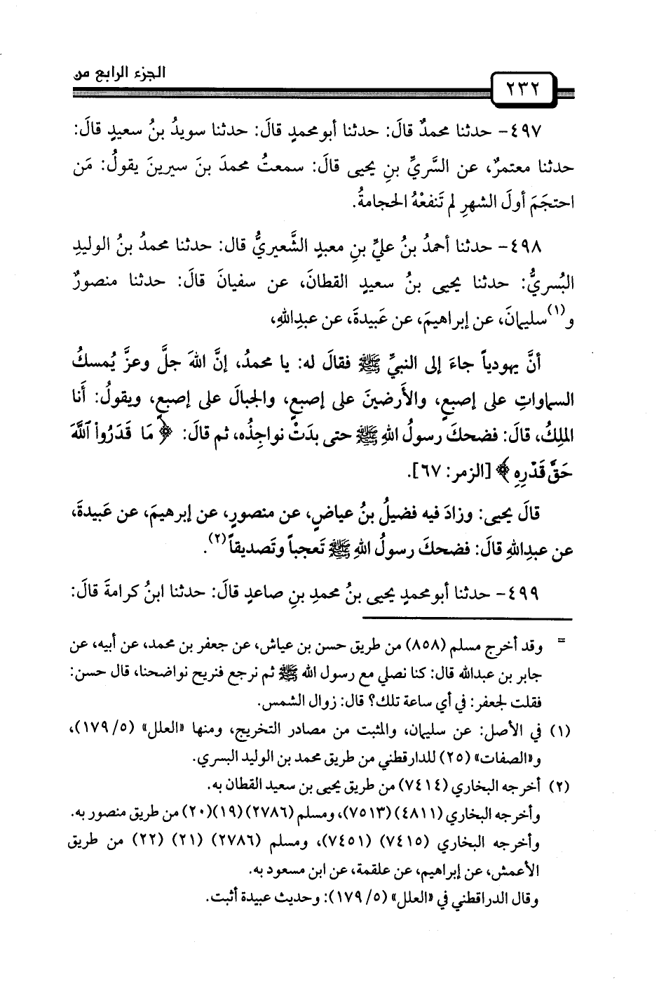 498 - حَدَّثَنَا أحمدُ بنُ عليِّ بنِ معبدٍ الشَّعيريُّ قَالَ: حَدَّثَنَا محمدُ بنُ الوليدِ البُسريُّ: حَدَّثَنَا يَحْيَى بنُ سعيدٍ القطانَ، عَنْ سفيانَ قالَ: حدثنا منصورٌ وسليمانَ، عن إبراهيمَ، عن عَبيدةَ، عن عبدِاللهِ،