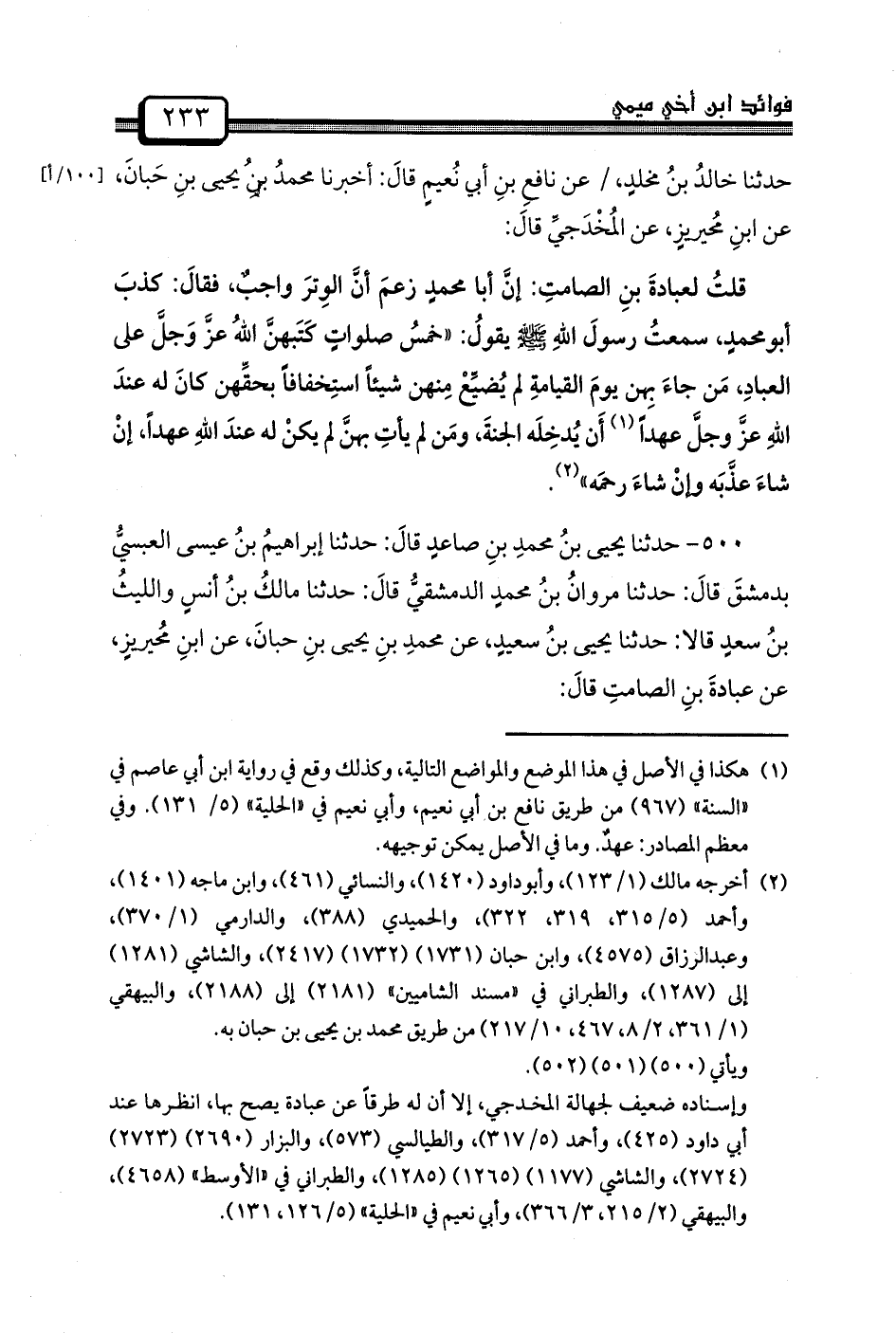 500 - حَدَّثَنَا يَحْيَى بنُ محمدِ بنِ صاعدٍ قالَ: حَدَّثَنَا إبراهيمُ بنُ عِيسَى العبسيُّ بدمشقَ قالَ: حَدَّثَنَا مروانُ بنُ محمدٍ الدمشقيُّ قالَ: حَدَّثَنَا مالكُ بنُ أنسٍ والليثُ بنُ سعدٍ قَالا: حَدَّثَنَا يَحْيَى بنُ سعيدٍ، عَنْ محمدِ بنِ يحيى بنِ حبانَ، عن ابنِ مُحيريزٍ، عن عبادةَ بنِ الصامتِ قالَ: