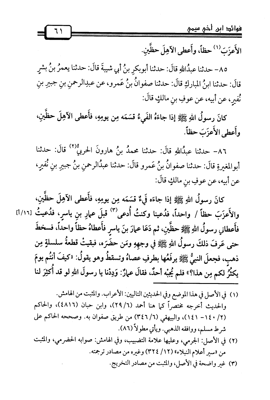 كانَ رسولُ اللهِ صَلَّى اللَّهُ عَلَيْهِ وَسَلَّمَ إِذَا جاءَه فَيءٌ قسَمَه مِن يومِهِ، فأَعطى الآهِلَ حظَّينِ، والأَعزَبَ حَظًّا / وَاحِدًا، فدُعينا وكنتُ أُدعى قبلَ عمارِ بنِ ياسرٍ، فدُعيتُ فأَعطاني رسولُ اللهِ صَلَّى اللَّهُ عَلَيْهِ وَسَلَّمَ حظَّينِ، ثُمَّ دَعَا عمارَ بنَ ياسرٍ فأَعطاهُ حَظًّا وَاحِدًا، فسخطَ حَتَّى عَرفَ ذلكَ رسولُ اللهِ صَلَّى اللَّهُ عَلَيْهِ وَسَلَّمَ فِي وجهِهِ ومَن حضَرَه، فبقيتْ قطعةُ سلسلةٍ مِن ذهبٍ، فجعلَ النبيُّ صَلَّى اللَّهُ عَلَيْهِ وَسَلَّمَ يرفَعُها بطرفِ عصاهُ وتسقطُ وَهُوَ يقولُ: "كيفَ أنتُم يومَ يكثُرُ لَكُمْ مِن هذا؟ " فلم يُجبْه أحدٌ، فقالَ عمارٌ: وَدِدْنا يَا رسولَ اللهِ لَوْ قَدْ أُكثِرَ لَنَا -[62]- مِن هَذَا.